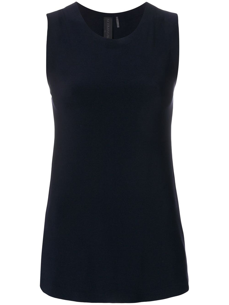 Discover a midnight-blue sleeveless crewneck with comfortable stretch and a straight hem that layers easily for fall. This Norma Kamali top gives a polished silhouette that moves with you and simplifies daily dressing. Expect easy-care fabric and a versatile cut that pairs with tailored trousers or casual denim.