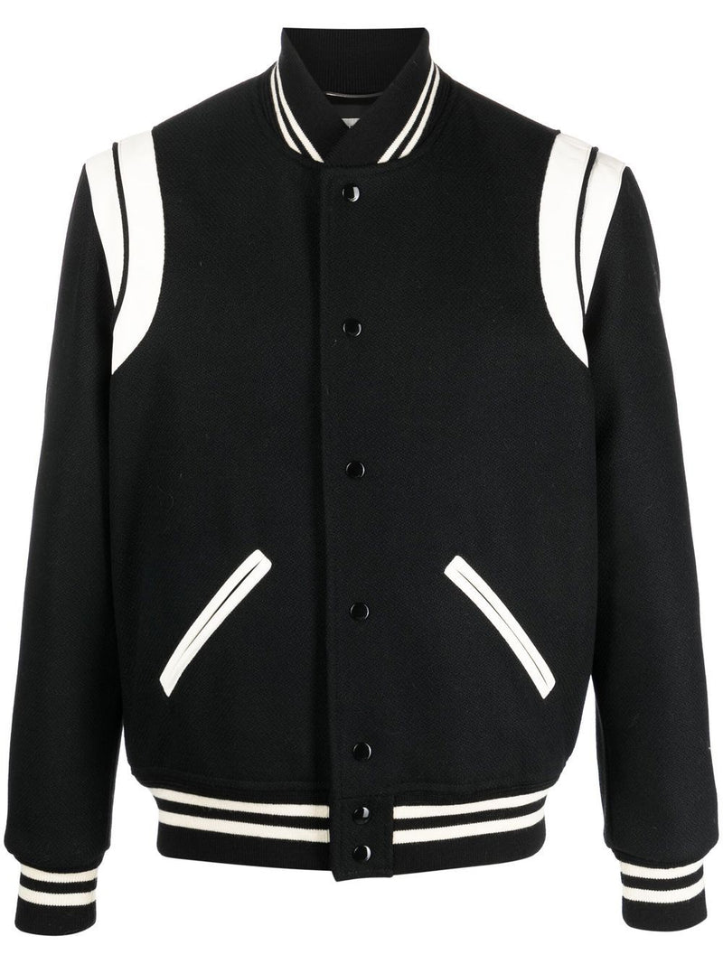 Inspirada en los códigos universitarios, esta chaqueta bomber Eddy en blanco y negro de Saint Laurent es legendaria. Lucida por multitud de celebridades, posee un atractivo universal del que querrás formar parte. Querrás tenerla en tu colección. Presenta cuello acanalado, cierre de botones a presión, bolsillos de ribete delanteros, manga larga, bajo y puños acanalados, forro completo y ribete de rayas. Talla y ajuste: Esta prenda talla normal. Recomendamos elegir tu talla habitual. La modelo mide 1,84 m y usa la talla 48 (IT).