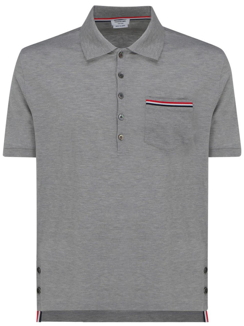 This light grey cotton polo from Thom Browne features the signature RWB stripe logo patch at the chest and a classic polo collar with a front button placket for a refined look. Short sleeves, a chest patch pocket and side button fastenings complement the tailored silhouette, while the high-low hem adds modern movement. Crafted in soft cotton for everyday wear, it balances casual comfort with the brand's distinct detailing.