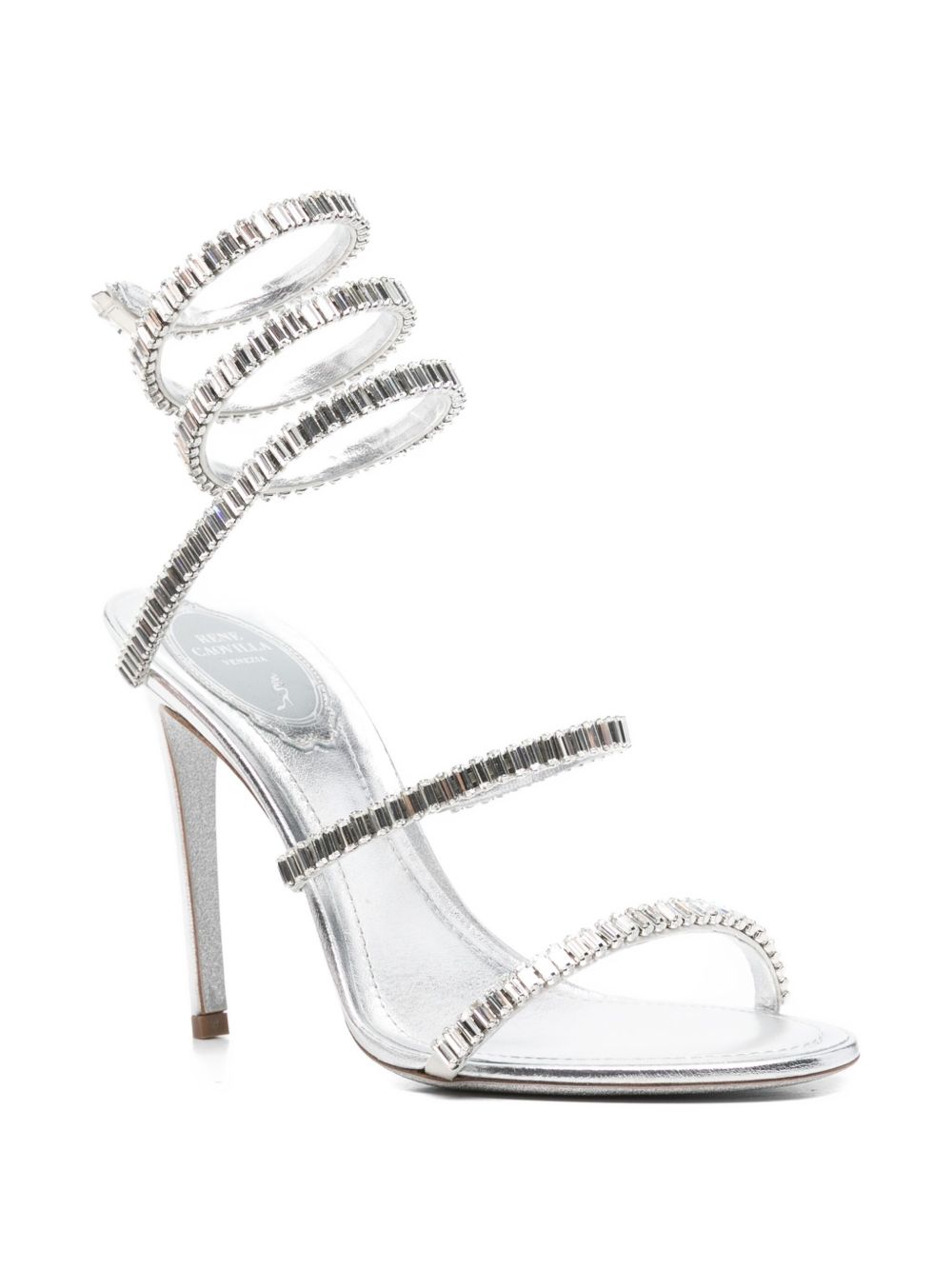 These René Caovilla sandals in silver combine handcrafted embellishment with a sculpted 10.5 cm heel to elevate evening looks while remaining wearable. The leather upper, snakehead detail and hand-applied rhinestones create refined texture and sparkle, and a stardust sole adds subtle shine underfoot. Designed for adult women, they pair with tailored or formal outfits to provide height and a statement finish.