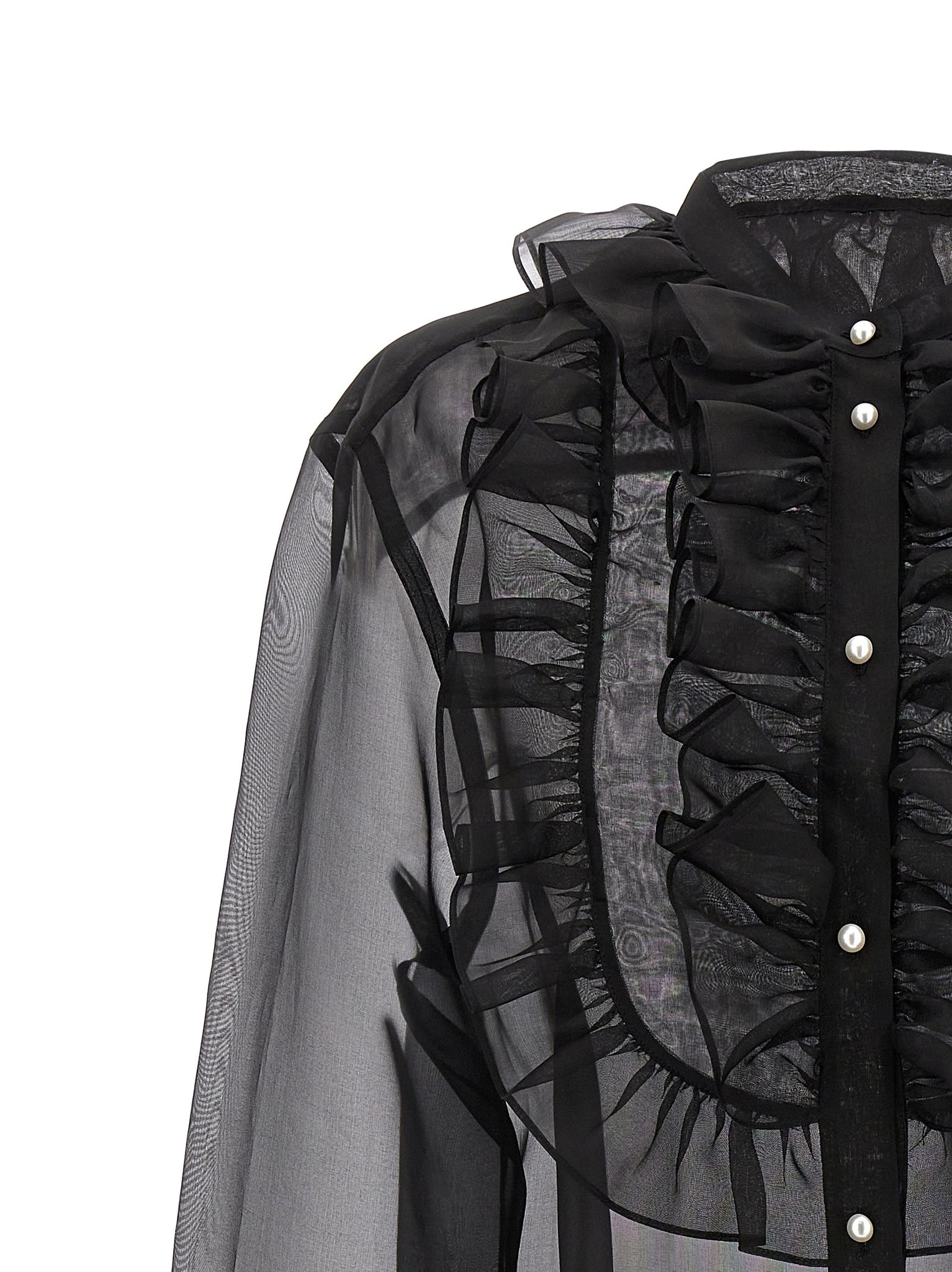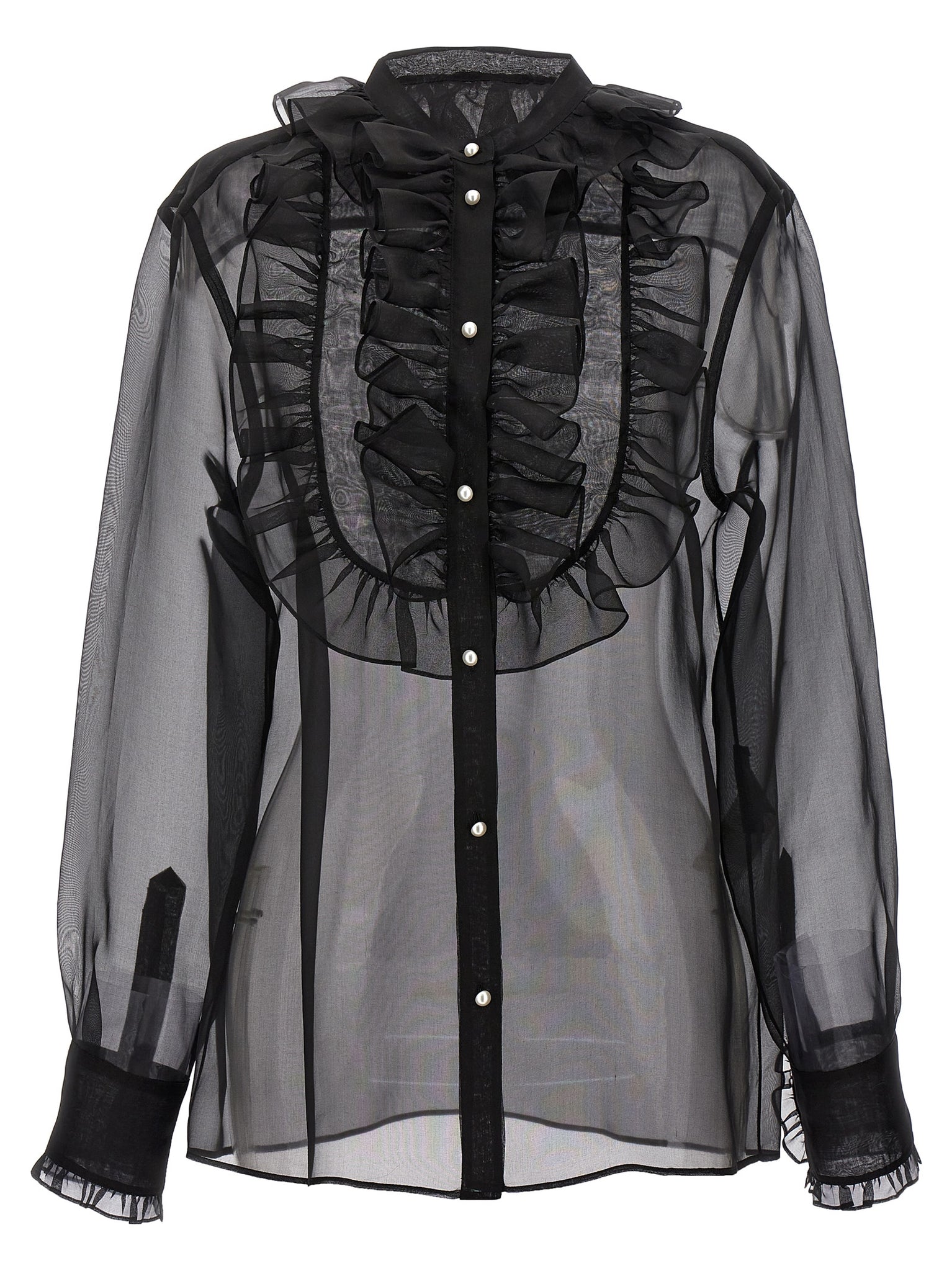 Silk organza shirt with plastron and ruffles, button closure, long sleeves. Size and Fit - True to size fit