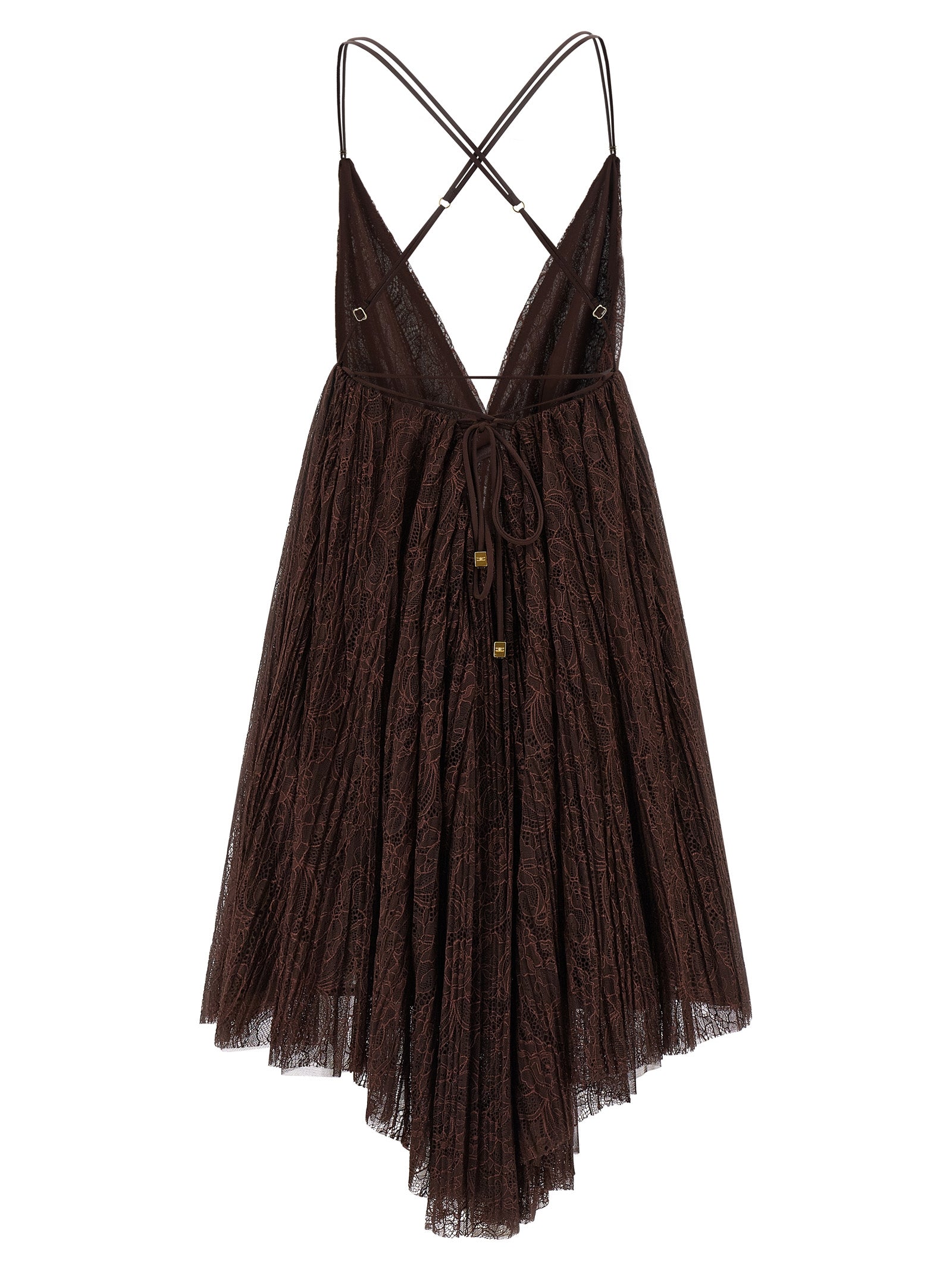 Discover the Elisabetta Franchi Lace Mini Dress in brown, a baby‑doll silhouette that flatters with a pleated floral lace overlay and soft Georgette lining for comfortable wear. Thin crossed adjustable straps and gold logo metal details add polished accents while a back anodable lace closure secures the fit. True to size—this piece balances delicate detailing with everyday wearability for evening or daytime occasions.
