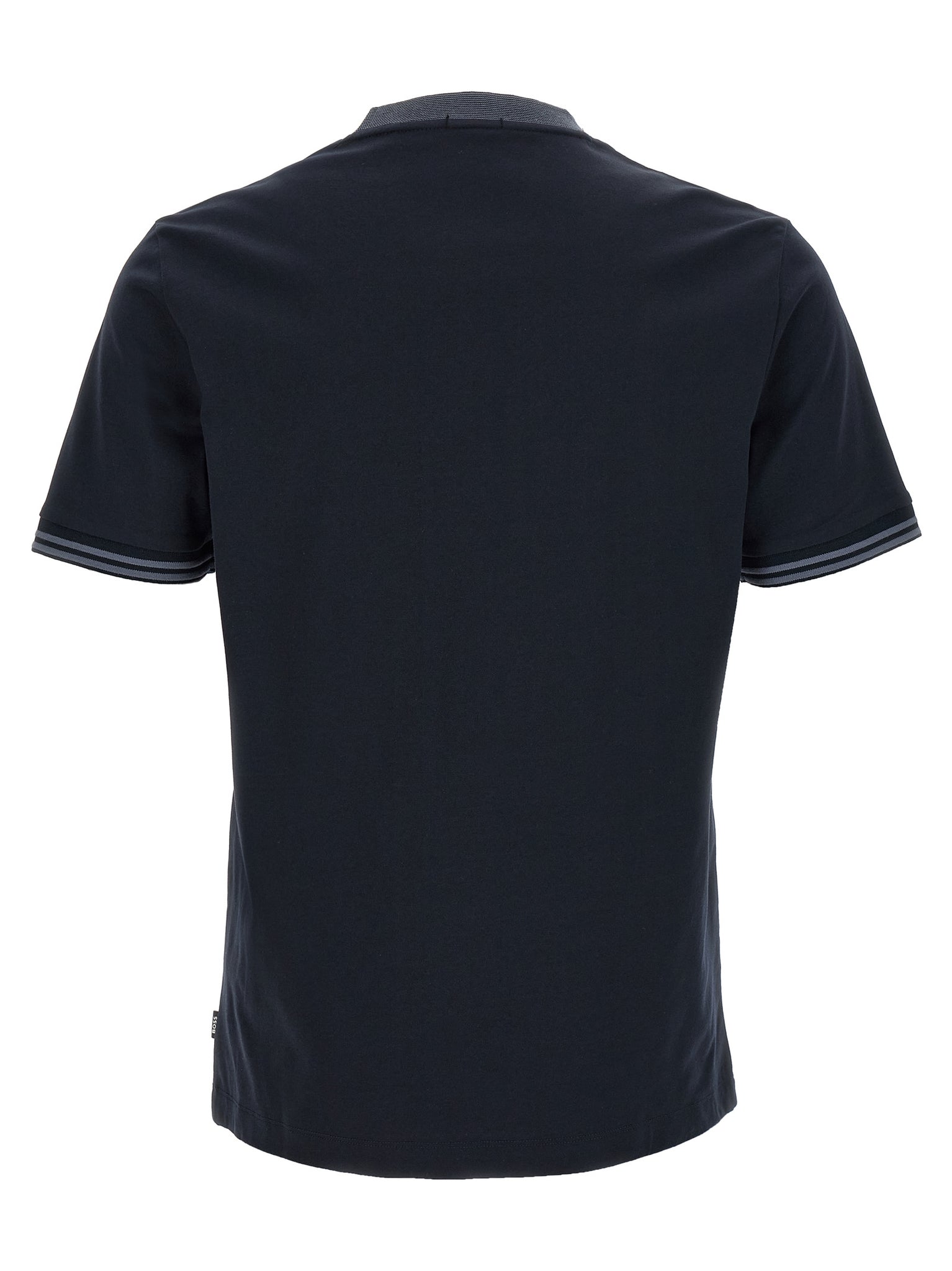 Discover a refined crewneck tee in blue that balances comfort and tailored shape, crafted from mercerized cotton for a smoother hand and subtle sheen. Contrast detailing and short cuffed sleeves refine the silhouette while the slim fit offers a contemporary profile ideal for layering or wearing alone. Designed for adult men, this Hugo Boss piece pairs smartly with casual or elevated wardrobes and is simple to care for.