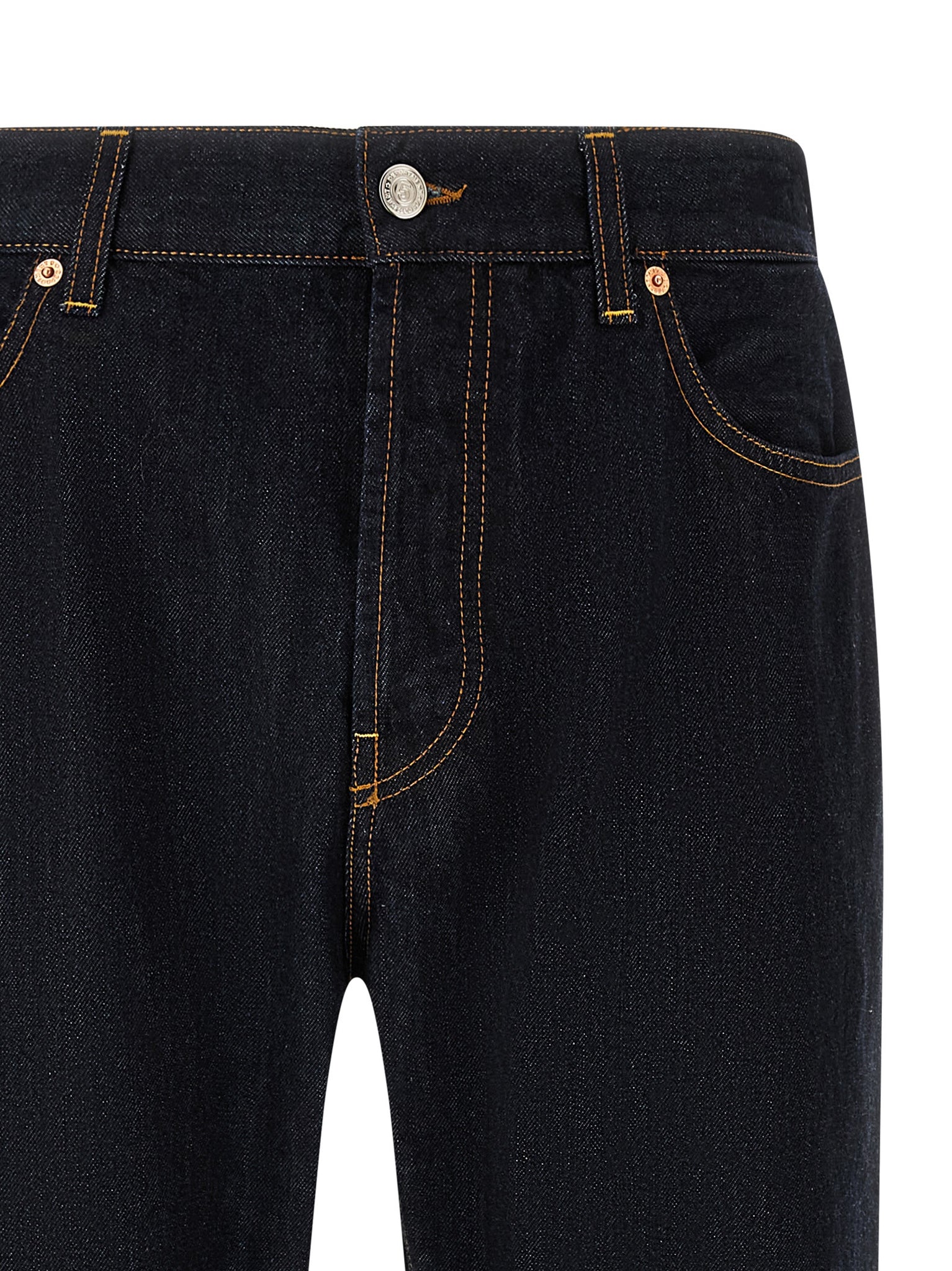 13 1/4 oz non-stretch cotton denim 'bowl' jeans, Contrast stitching, Wide straight leg, Medium waist, Front button closure, Five pockets, Back logo tag.