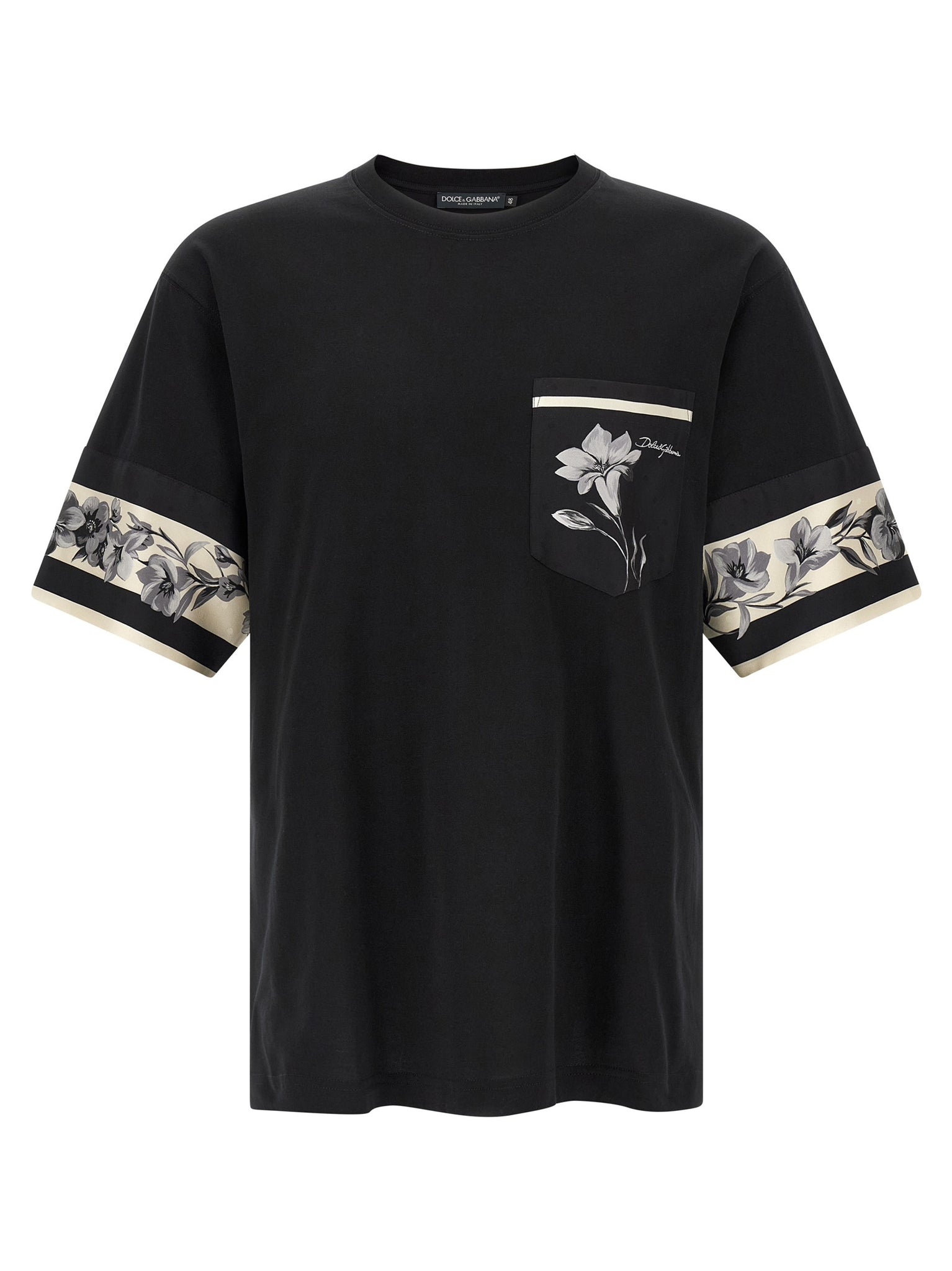 Light cotton jersey T-shirt with 'Bouquet' print silk twill details, breast pocket, crew neck, long sleeves with insert and dropped shoulders._x000D_ The differences in print placement you might find on this product is a characteristic of Dolce&Gabbana's Handmade products. A peculiarity that makes each garment or accessory unique and exclusive. Size and Fit - true to size fitMade in: Italy