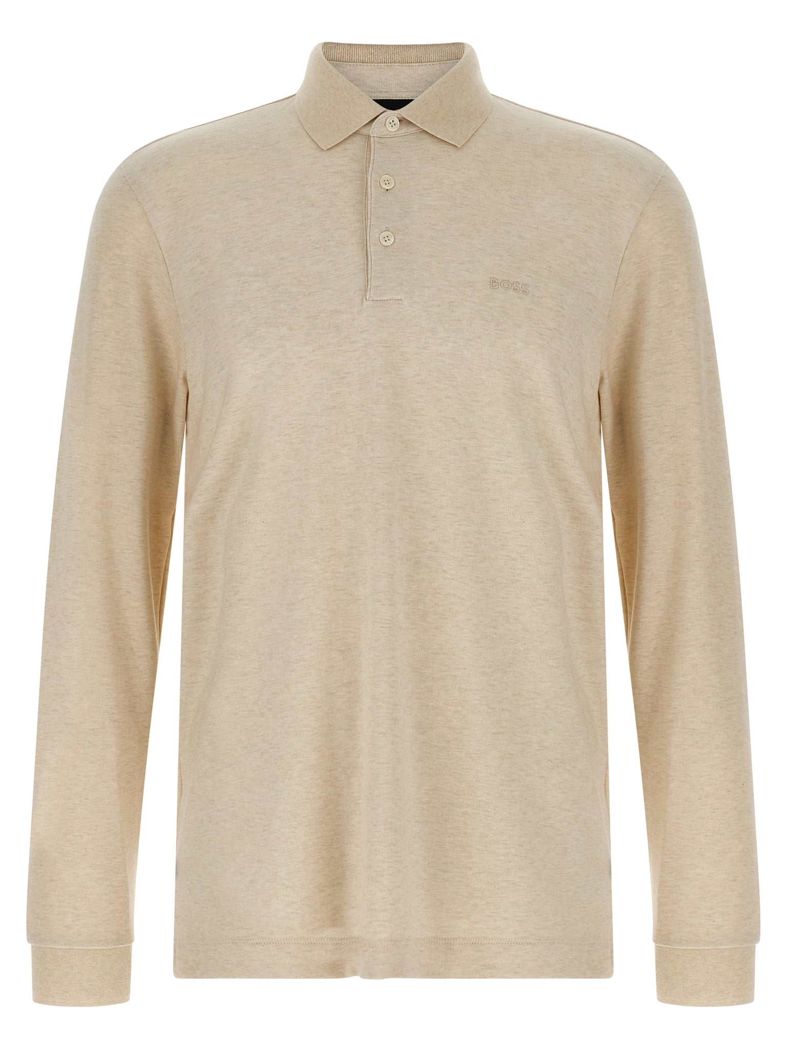 'pado 30' cotton interlock mélange polo shirt with tone-on-tone embroidery on the front, Collar and buttons, Long cuffed sleeves and side slits. Size and Fit - true to size fit