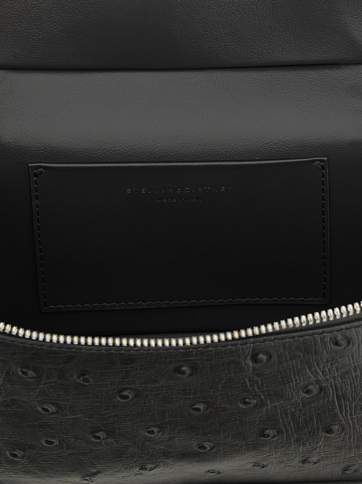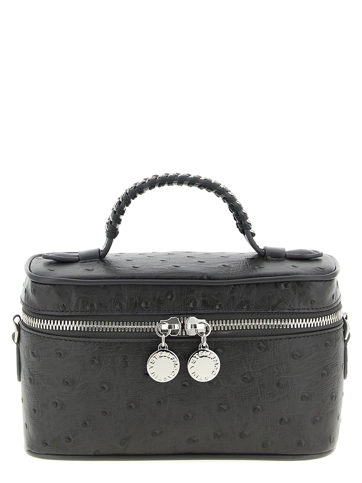 Vanity falabella crossbody bag in eco micely ostrich alter mat fabric, Fixed handle, Zip closure, Removable chain shoulder strap. Sustainable: products that do not use leather in accordance with cruelty-free ethics. Size and Fit - W 19 x H 11 x D 8 cm