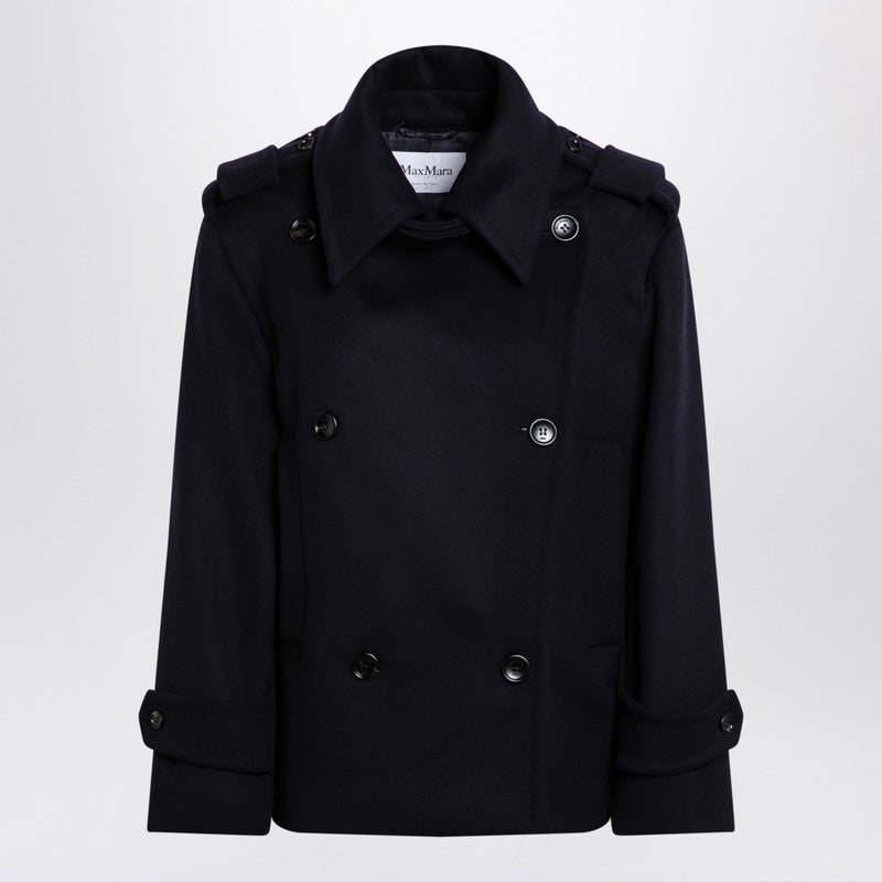 Manteau court croisé bleu en laine vierge et cachemire Max Mara. Col pointu, manches longues, patte de boutonnage sur le devant, deux poches passepoilées latérales, badges aux épaules et double fente au dos. Taille et coupe : Le mannequin porte une taille 40 IT. Mensurations : Taille : 179 cm, Poitrine : 82 cm, Taille : 65 cm, Hanches : 90 cm.