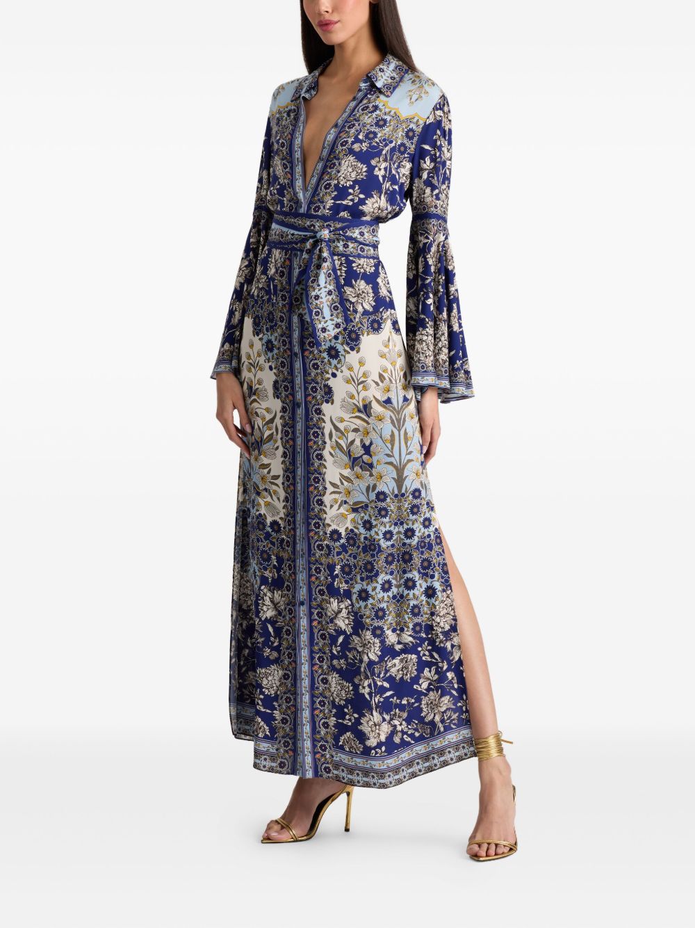 Chemise à imprimé floral bleu, manches cloche, col boutonné, ceinture à nouer