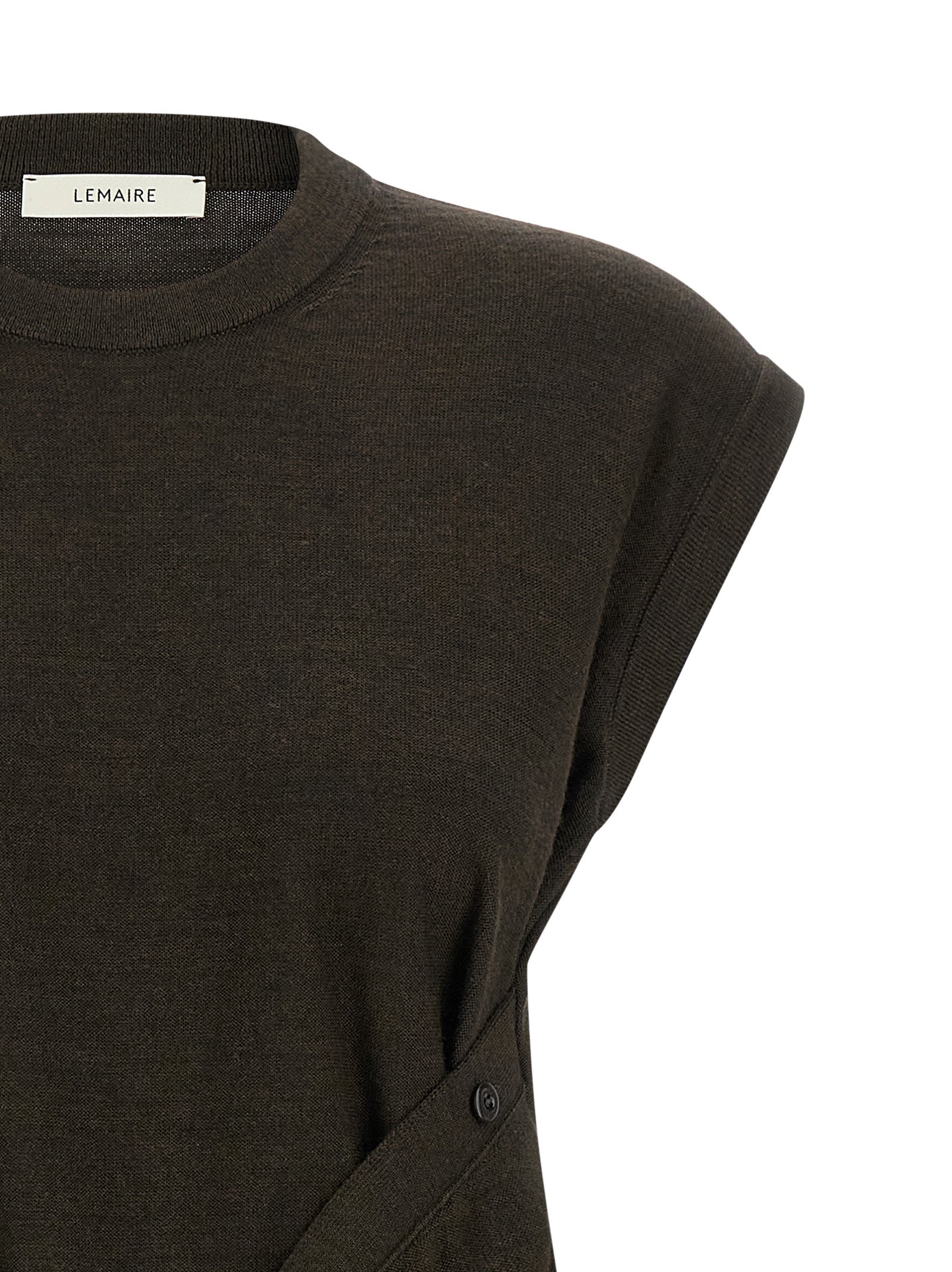 Discover a refined merino wool blend top that offers breathable warmth and a smooth handfeel, designed for a true-to-size fit. The crew neck and innovative side panels include buttons on one side and eyelets on the other, so you can tie or drape the panels for versatile styling. This brown Lemaire piece updates wardrobe fundamentals with subtle hardware and adaptable shaping.