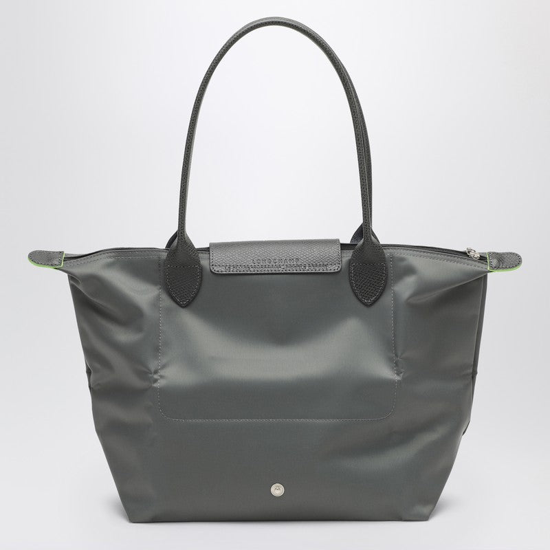 Sac bandoulière Longchamp de taille moyenne en polyamide recyclé Econyl couleur graphite avec détails en cuir. Il est doté de deux poignées supérieures, d'un rabat à fermeture magnétique, d'une fermeture zippée et d'un compartiment principal. Dimensions : largeur 28 cm x hauteur 26,5 cm x profondeur 15,5 cm. Hauteur de la poignée : 20 cm.