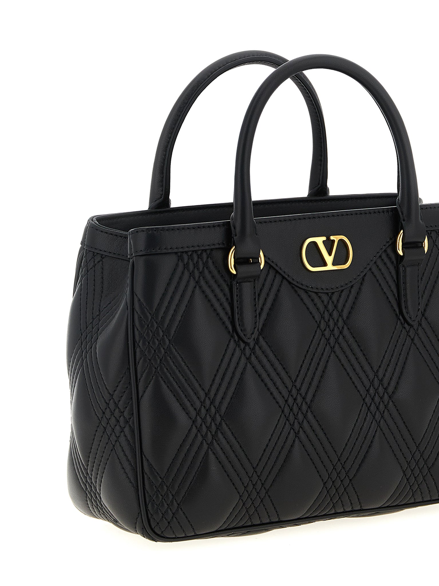 Quiltie 67' quilted nappa leather handbag with diamond-shaped weave outlined by tone-on-tone stitching, Vlogo signature metallic antiqued effect on the front, Double fixed handle, Adjustable and removable shoulder strap. Size and Fit - W 25.5 x H 19.5 x D 10 cm