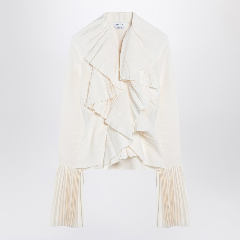 Chemisier en viscose de cellulose ivoire Alexander McQueen, avec détails plissés, manches longues avec poignets boutonnés et col en V. Taille et coupe - Le mannequin porte une taille 38 IT. Mensurations du mannequin : Taille : 180 cm. Poitrine : 85 cm. Taille : 60 cm. Hanches : 93 cm.
