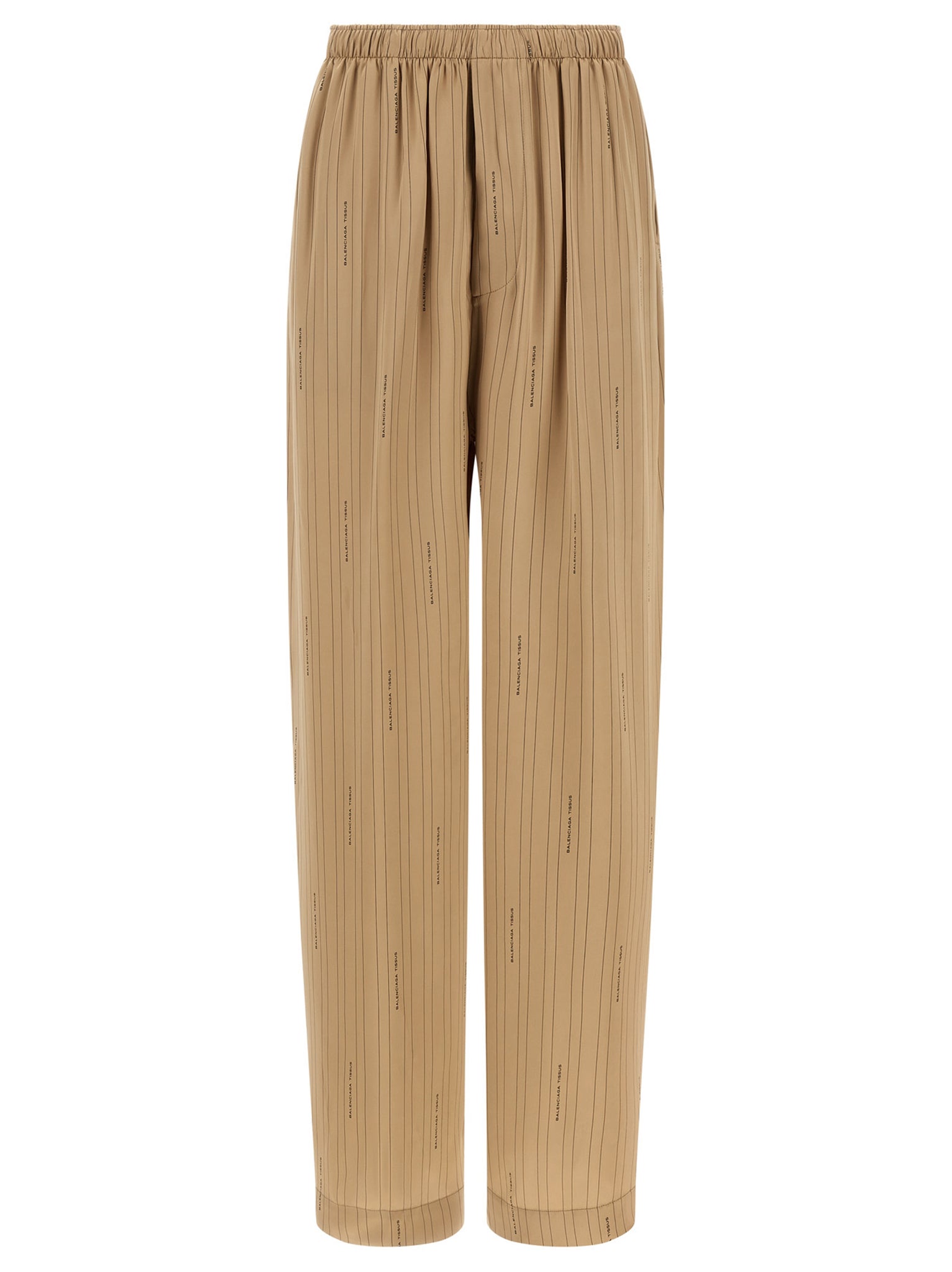 'Coocon' striped fluid viscose pants with all-over 'Balenciaga Tissus' logo, wide leg, adjustable drawstring elastic at the waist, button flap, pockets. Size and Fit - large fit - FRENCH size