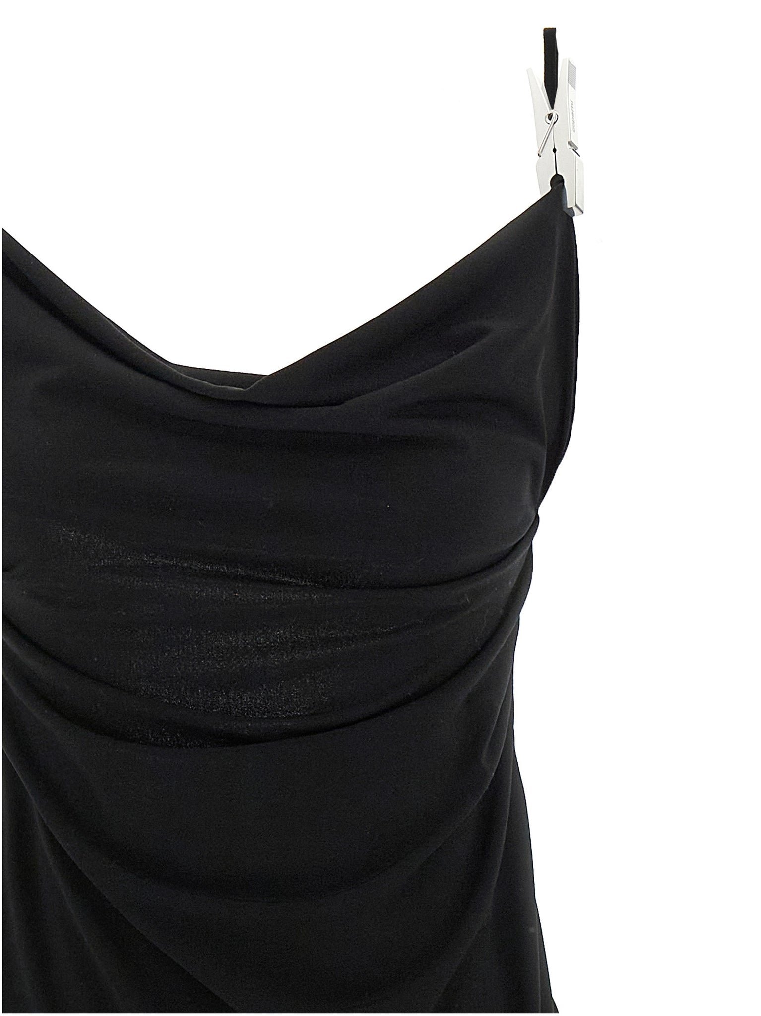 Washing clip gala' long dress in light jersey, Draped neckline, Sleeveless with thin straps, Silver metal clothespin details at the front and back, Wide asymmetrical neckline at the back, And slightly flared skirt. Size and Fit - true to size fit FRENCH size