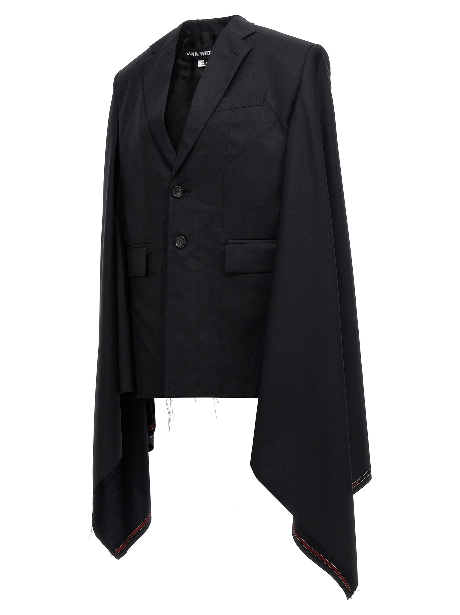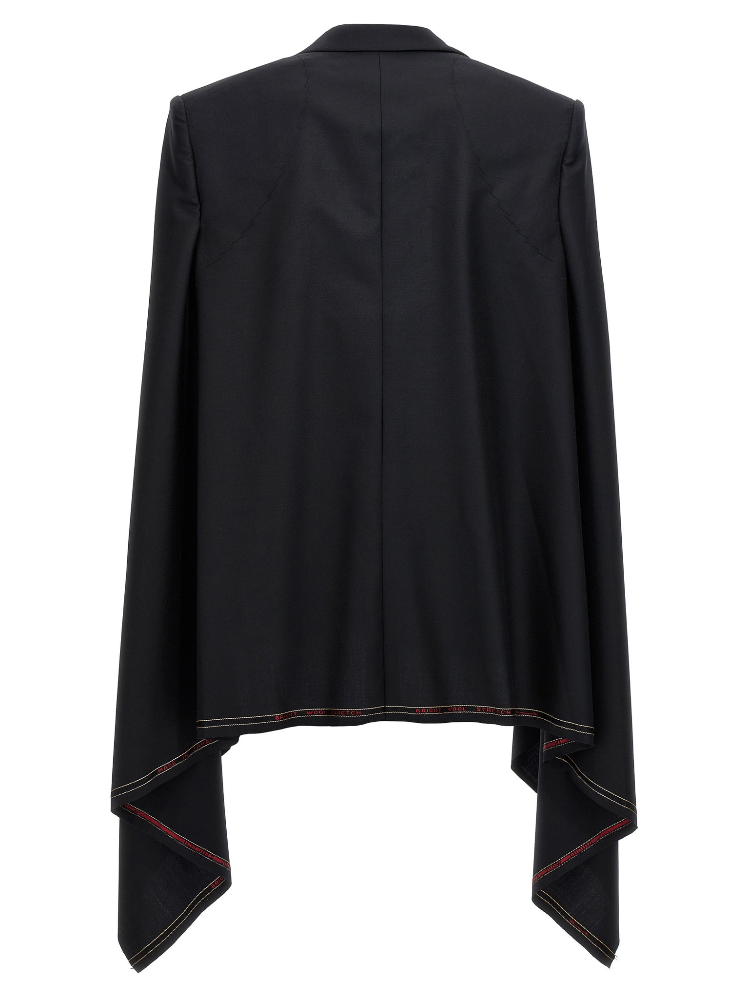 Wool cape with seized detail on the bottom hem, a button closure, pockets, padded shoulders, and wide sleeves. Size and Fit - oversize fit