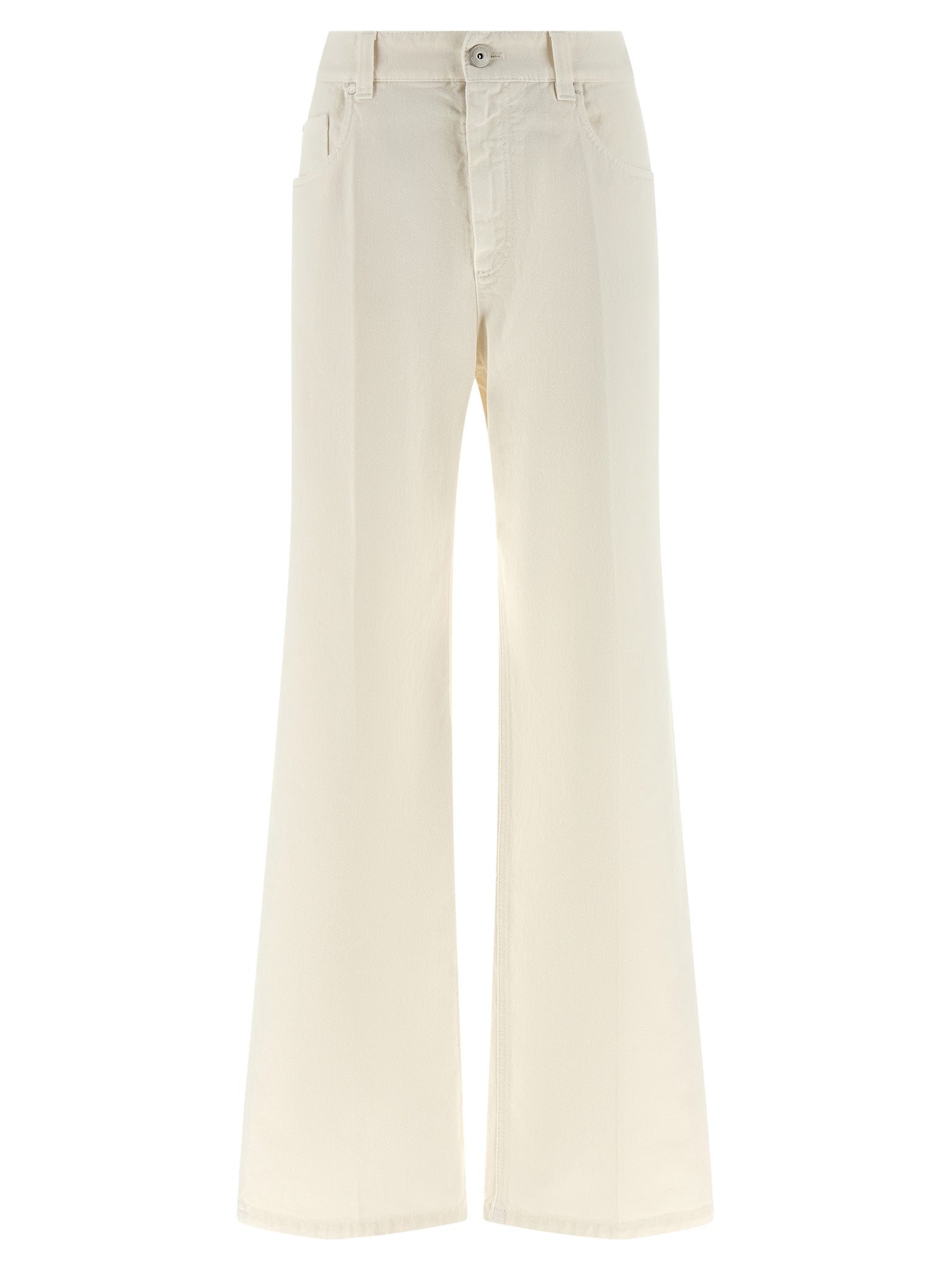 'The Contemporary Loose' jeans in garment-dyed cotton denim with stretched pleat, wide and straight leg, front zip and button closure, five pockets, Monile detail and leather logo label at the back. Size and Fit - true to size fit