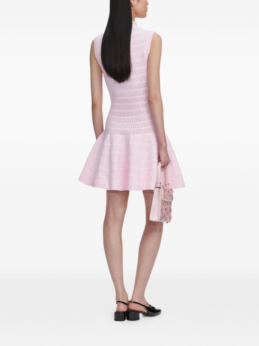 Discover a polished yet playful wardrobe option with this pink Self-Portrait mini dress that balances structure and texture for wearable elegance. The sleeveless, round-neck silhouette and A-line skirt create a flattering fit that moves comfortably from daytime events to evening plans. Button embellishments add subtle detail while the textured fabric offers visual interest without sacrificing ease of care.
