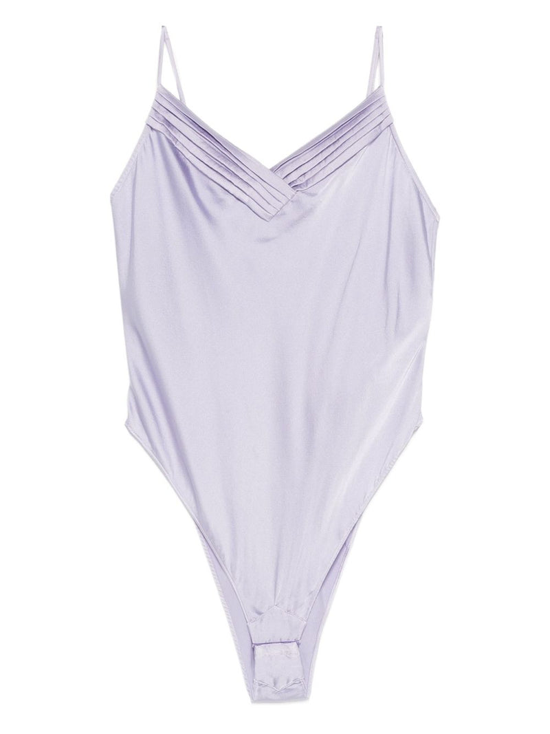 Discover a lilac silk satin bodysuit with a V-neck, ruched detail and spaghetti straps that offers a smooth, sleeveless silhouette ideal for layering under jackets or knits. The design guides a fitted look while the satin finish adds gentle sheen for evening or daytime styling. Note: this piece must be tried on over your own garments for hygiene reasons.