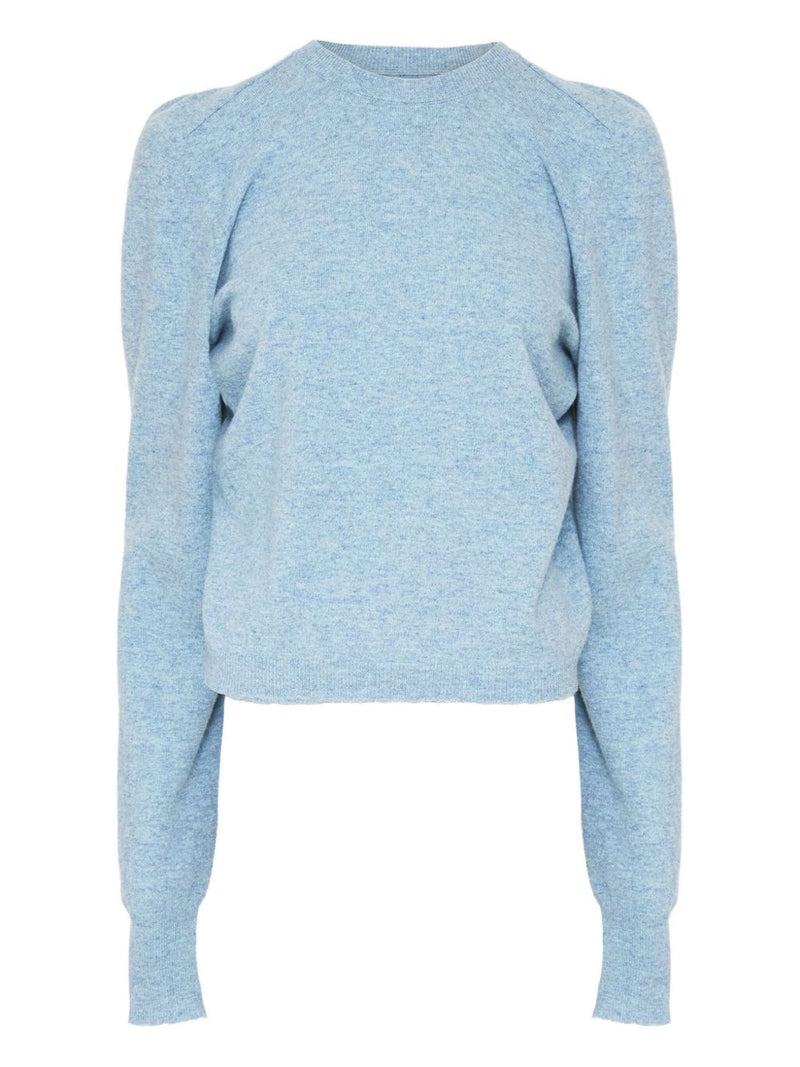blue wool crew neck long puff sleeves Wool crewneck sweater