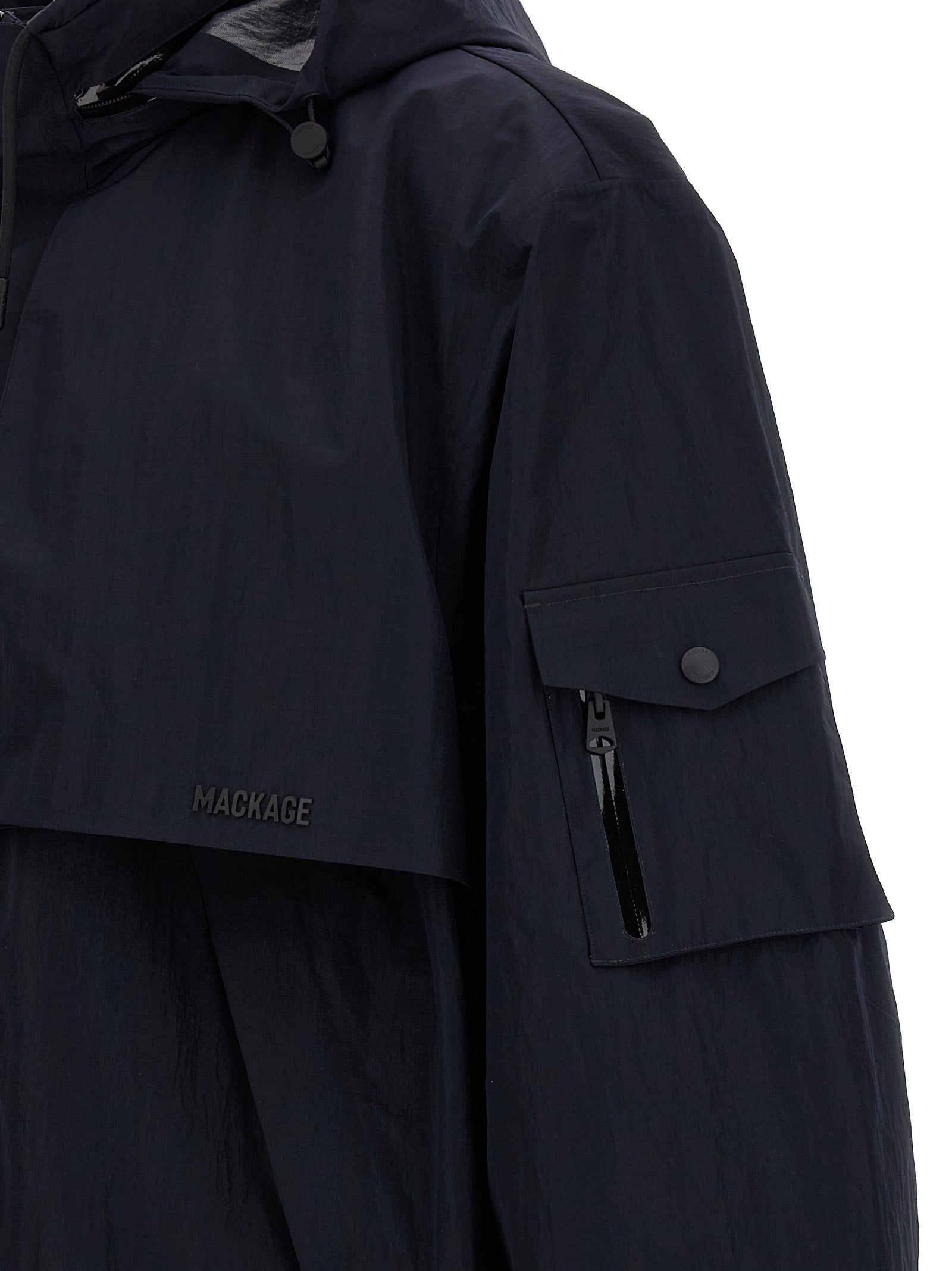The Mackage Garrett Jacket is a water-repellent technical jacket that keeps you dry while offering breathable comfort and a clean, embossed logo for subtle branding. It features a standing collar with a removable hood, zip closure with front snap buttons, long sleeves with elastic cuffs, practical pockets and an elastic hem for secure fit; the lining enhances airflow for active use. Designed true to size for US men, this blue jacket balances weather protection with mobility for everyday wear. LDin, details and measurements are provided to guide your fit and purchase decision.