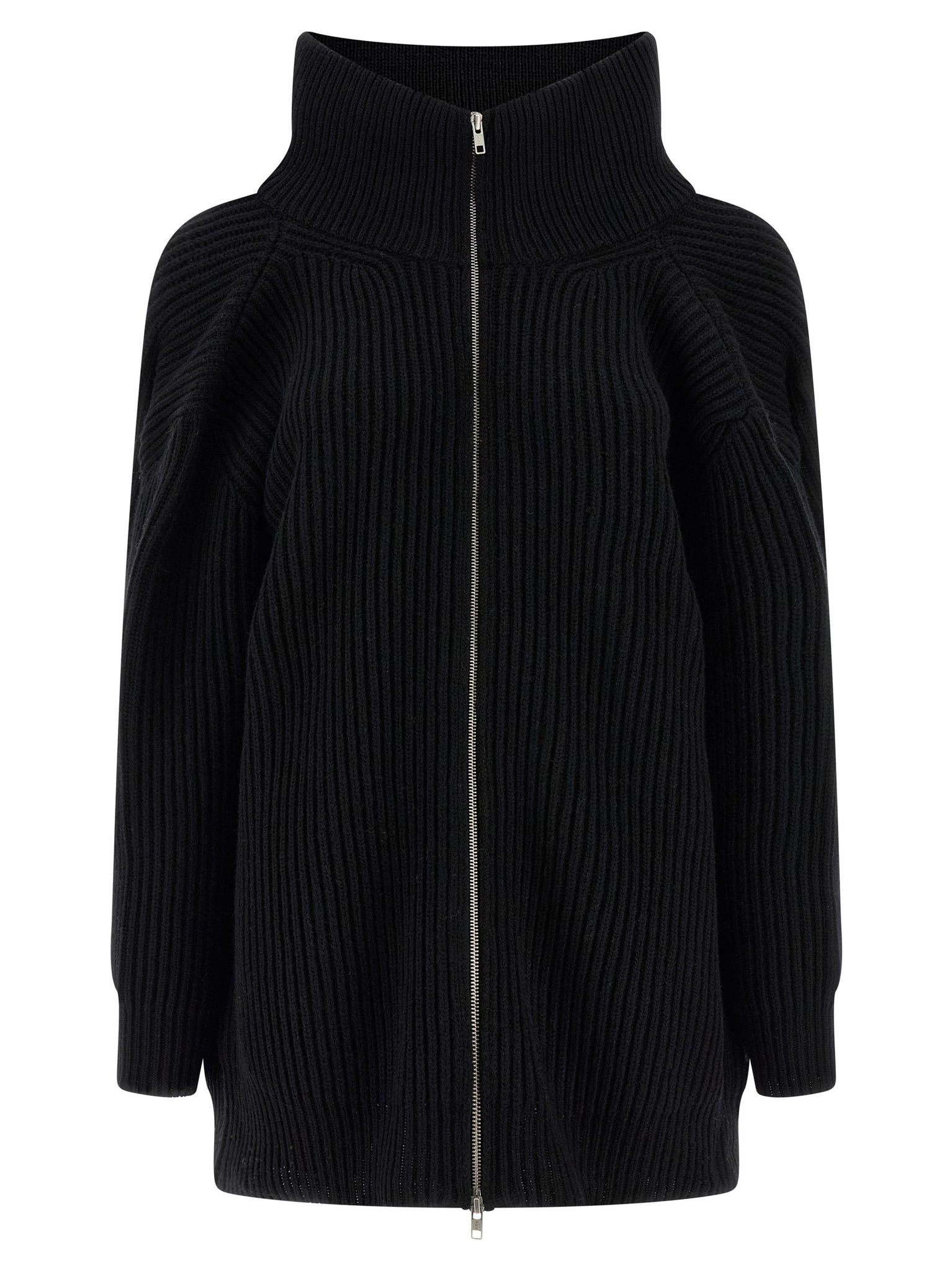 Cardigan mini ribbed wool knit dress with high neck, Front zip closure, Long sleeves with dropped shoulder, Tone-on-tone stretch knit back panel to adjust width, 'white stitch line' at the back. Size and Fit - oversized fit