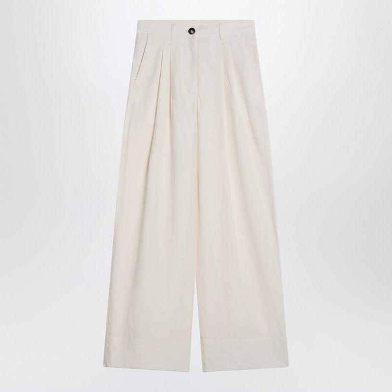 Pantalon large MKDT Studio en coton écru, caractérisé par une taille haute avec passants, une fermeture zippée et boutonnée sur le devant, deux poches passepoilées latérales, deux poches plaquées au dos et des plis sur le devant. Taille et coupe : Le mannequin porte une taille 36 FR. Mensurations : Taille : 178 cm, Poitrine : 89 cm, Taille : 62 cm, Hanches : 88 cm.