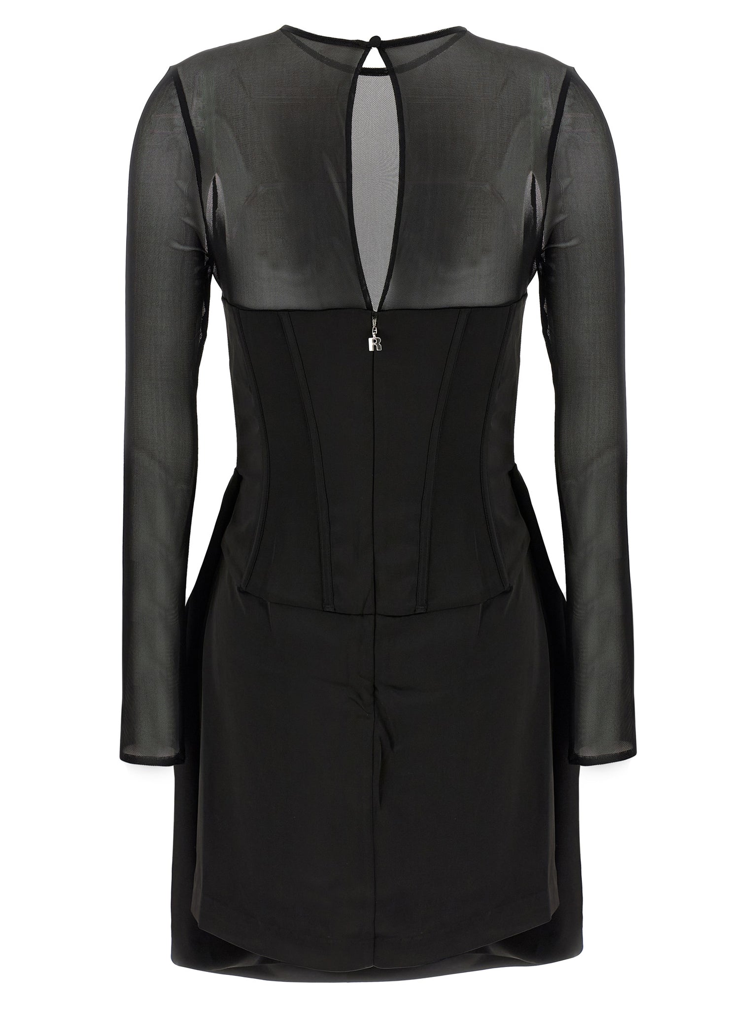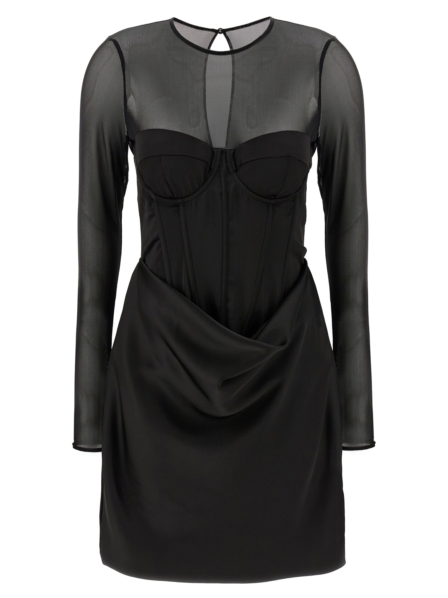 'satin corset mini' dress consisting of semi-transparent mesh top and satin bottom, Round neckline with back button closure and wide teardrop cut-out, Long sleeves, Corset construction partially attached to the skirt, Preformed cups, Splints, Front and back draping, Back zip closure. Size and Fit - true to size fit - GERMAN size