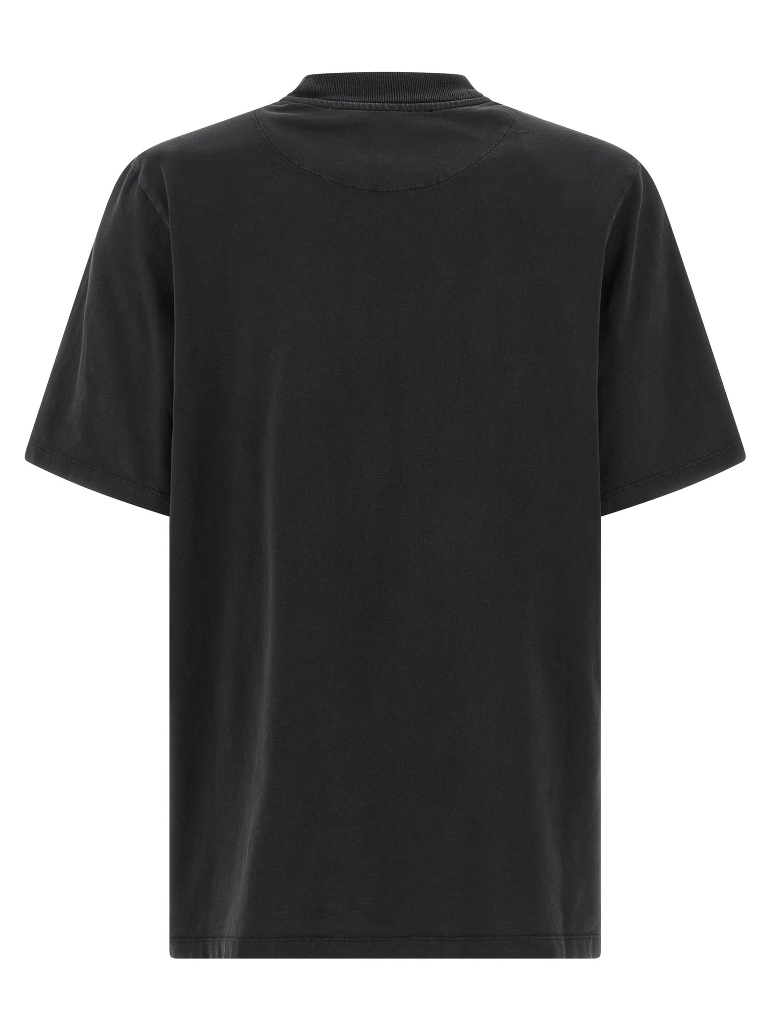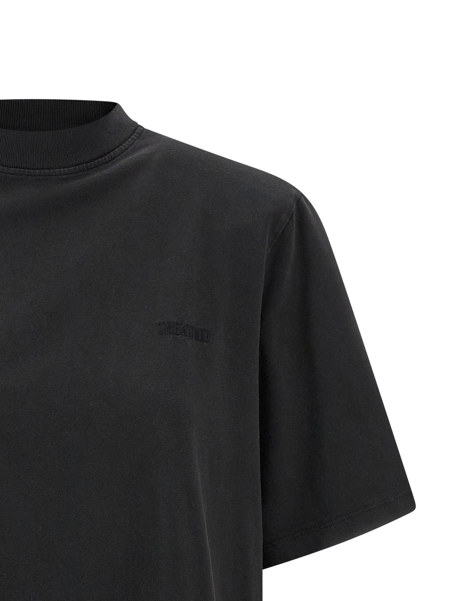 Faded cotton jersey t-shirt with tone-on-tone logo embroidery on the front, removable padded shoulder, short sleeves with dropped shoulders. Size and Fit - oversized fit