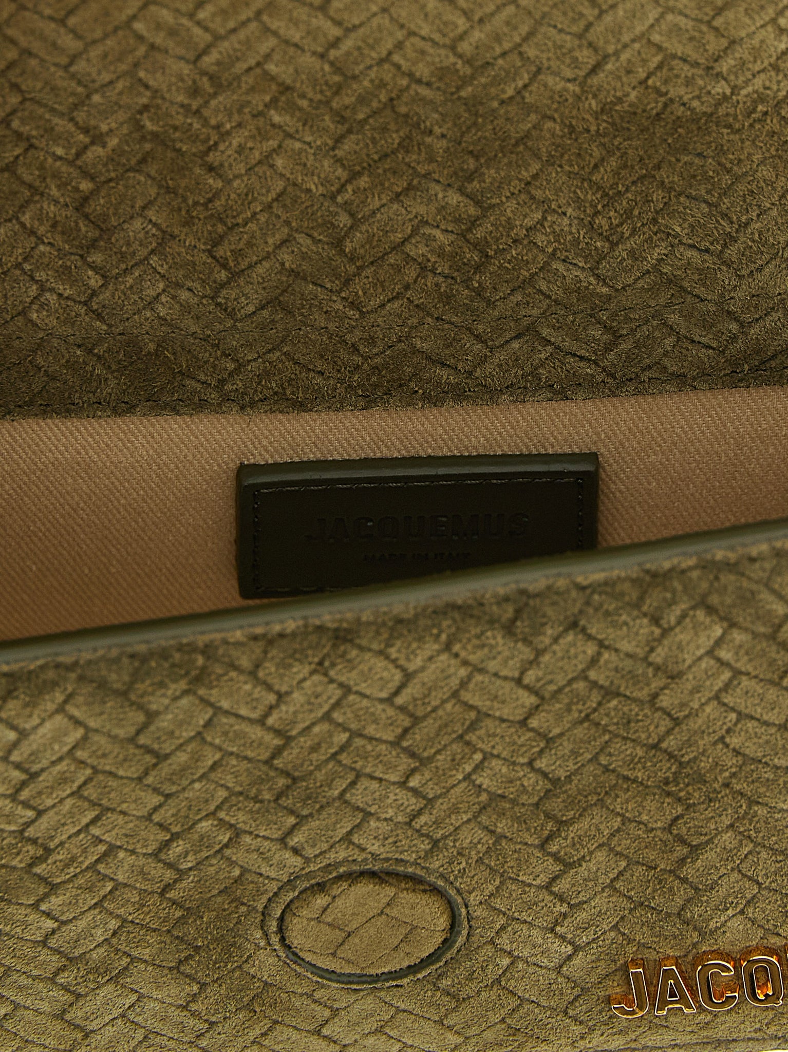 'Le Bambino' handbag in crocodile-effect embossed suede, magnetic flap closure, front metal lettering logo, fixed handle, back pocket, adjustable and removable shoulder strap._x000D_ Each leather is unique and has been carefully selected by a team of artisans. The model may have any imperfections or natural color variations. Size and Fit - W 17.5 x H 9 x D 6 cm
