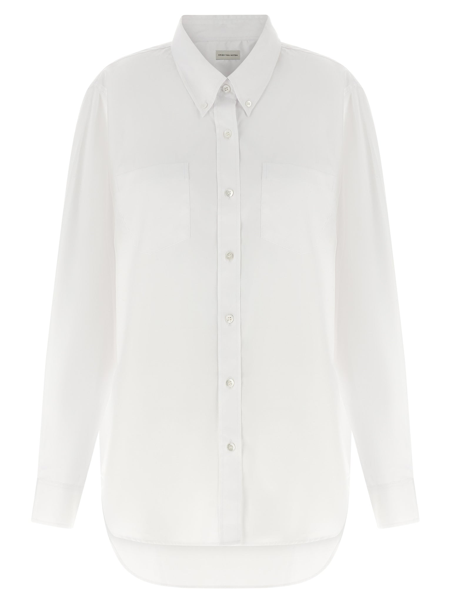 Discover a comfort-fit button-down that balances relaxed ease with tailored details: the Dries Van Noten Cheers Shirt in white cotton poplin features front mother-of-pearl buttons, two patch pockets, long cuffed sleeves, and a rounded, asymmetrical hem for subtle movement. The shirt’s construction favors breathable wear and effortless layering while the French sizing calls for checking measurements for an ideal fit. Designed for adult women, it pairs cleanly with tailored trousers or denim for versatile day-to-night styling.