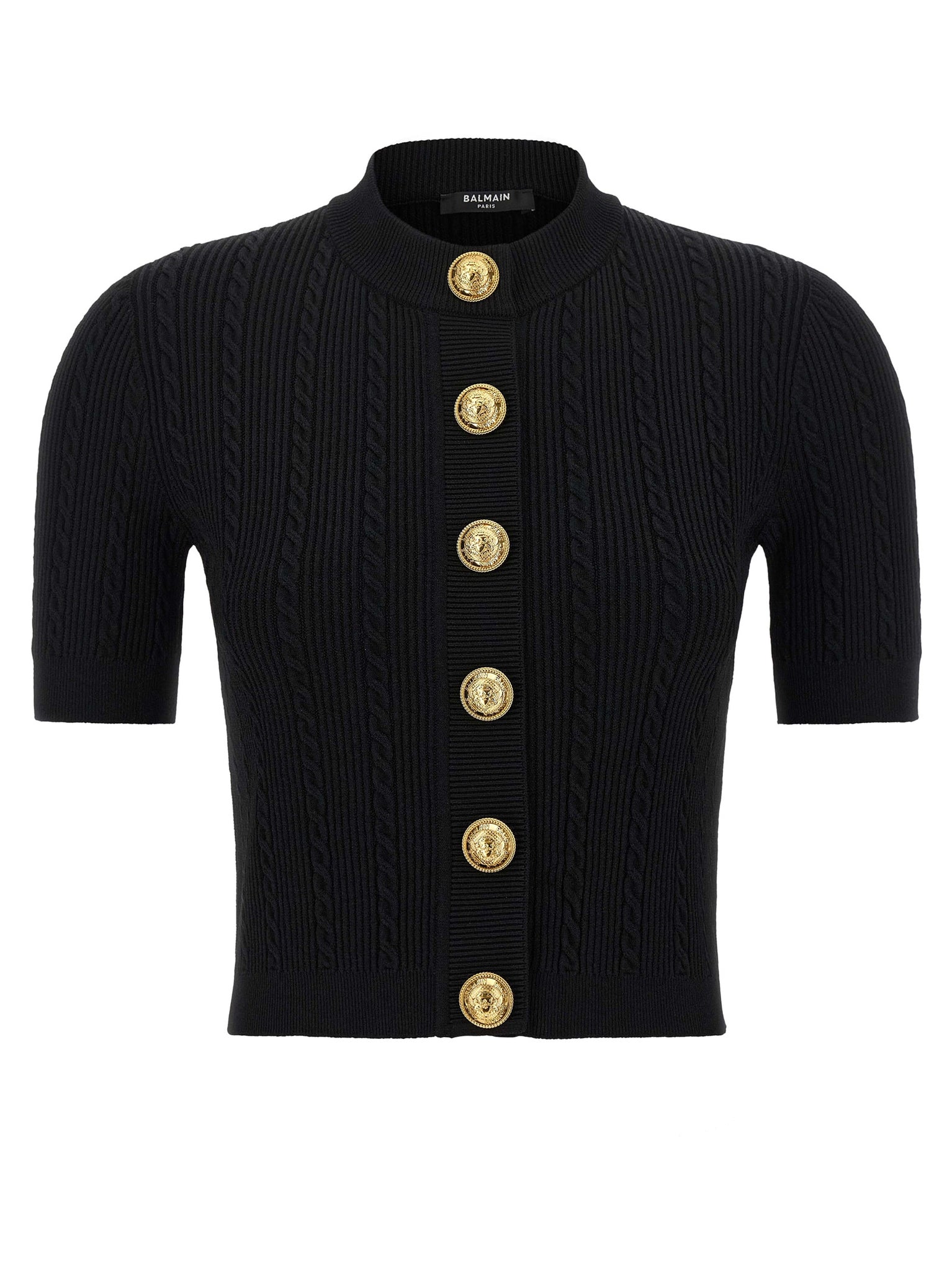 Ribbed knit and twisted cardigan, crop model, crew neck, front snap button closure with decorative metal buttons appliqué, short sleeves. Size and Fit - true to size fit - FRENCH size