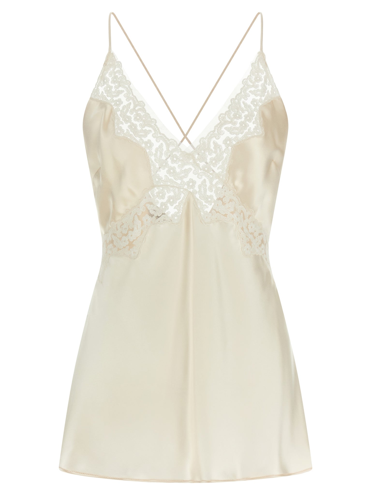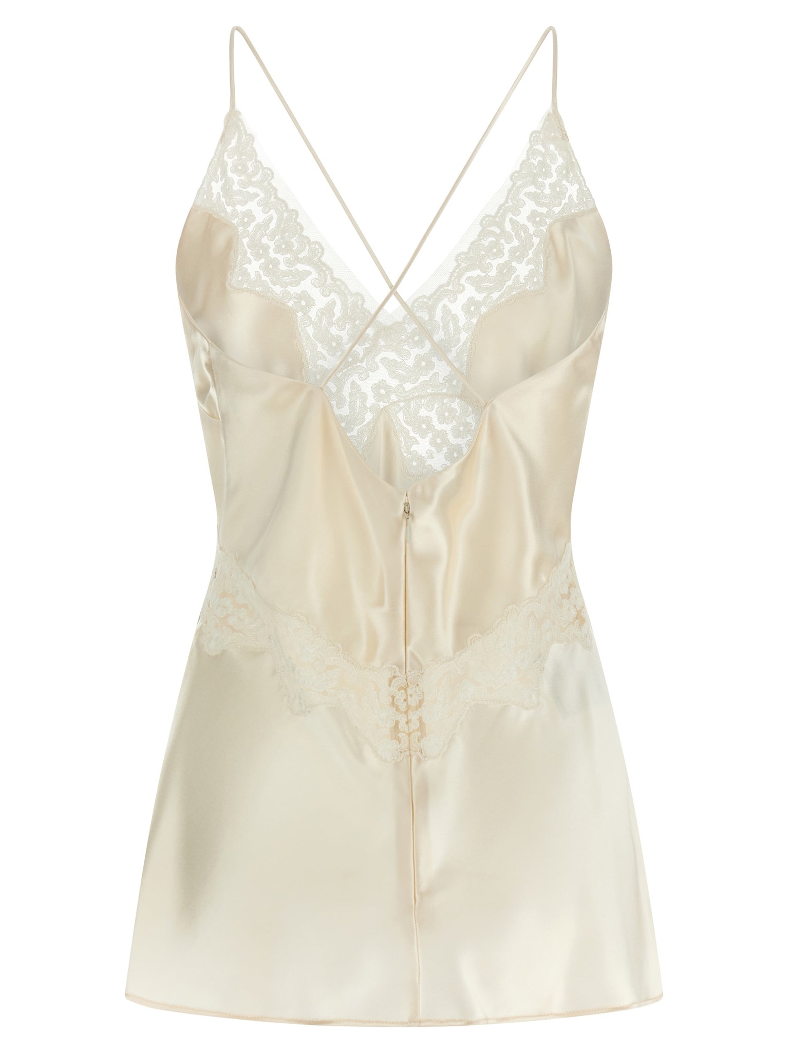 Satin top with tone-on-tone lace inserts, Hourglass silhouette, Thin crossed shoulder straps on the back, V-neck, And back zipper closure. Size and Fit - true to size fitMade in: Hungary