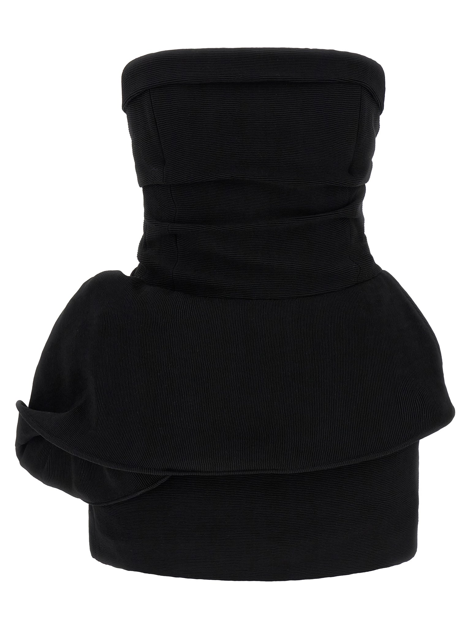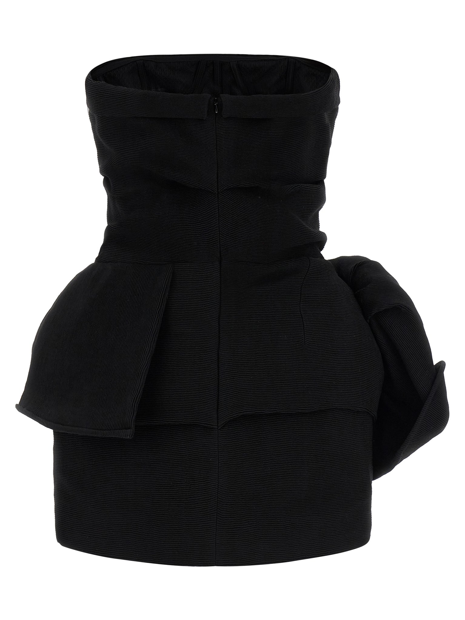 're26 dress 01' ribbed mini dress, Off-shoulder model with inner lace corset with back hooks, Padding in the bust, Draping pattern, Back closure with hidden zip. Size and Fit - True to size fit French sizing