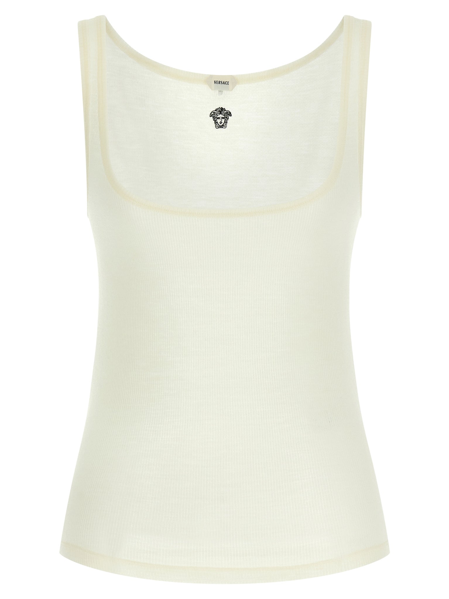 Stretch ribbed wool top with contrast 'La Medusa' embroidery at the back, round neckline, sleeveless. Size and Fit - True to size fit