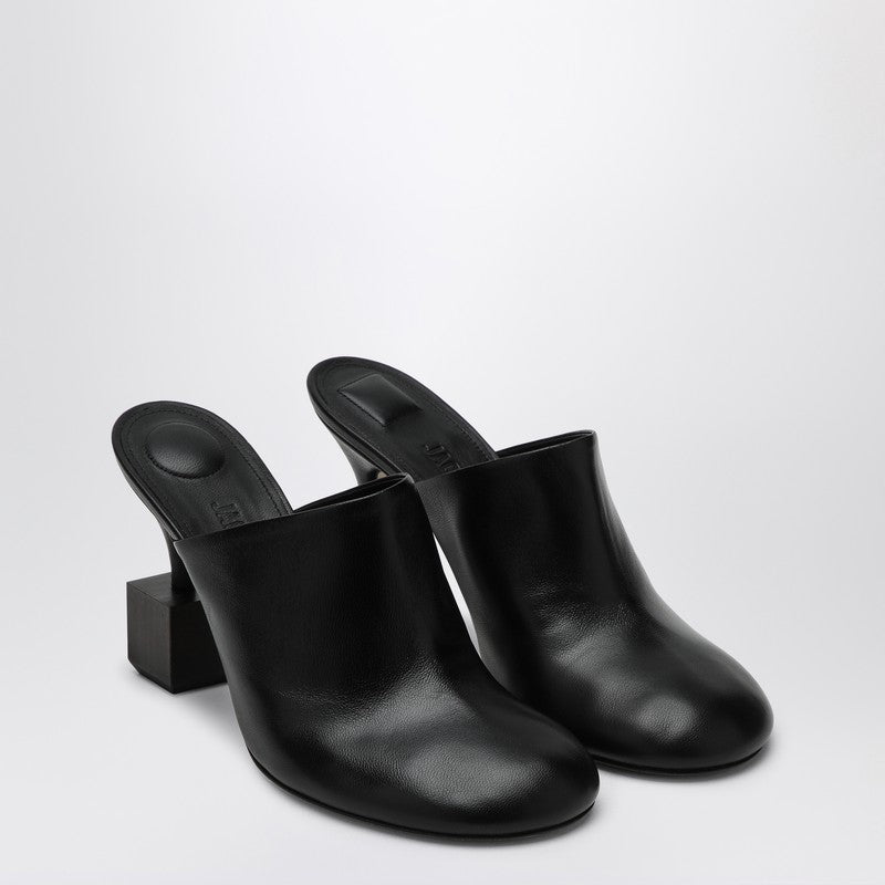 Mules en cuir lisse noir Jacquemus, caractérisées par un bout rond, une semelle intérieure et une doublure en cuir d'agneau avec coussinets, un talon gainé de cuir avec breloques en bois en forme de cercle et de carré, et une semelle en cuir. Pointure et coupe : Talon 9 cm