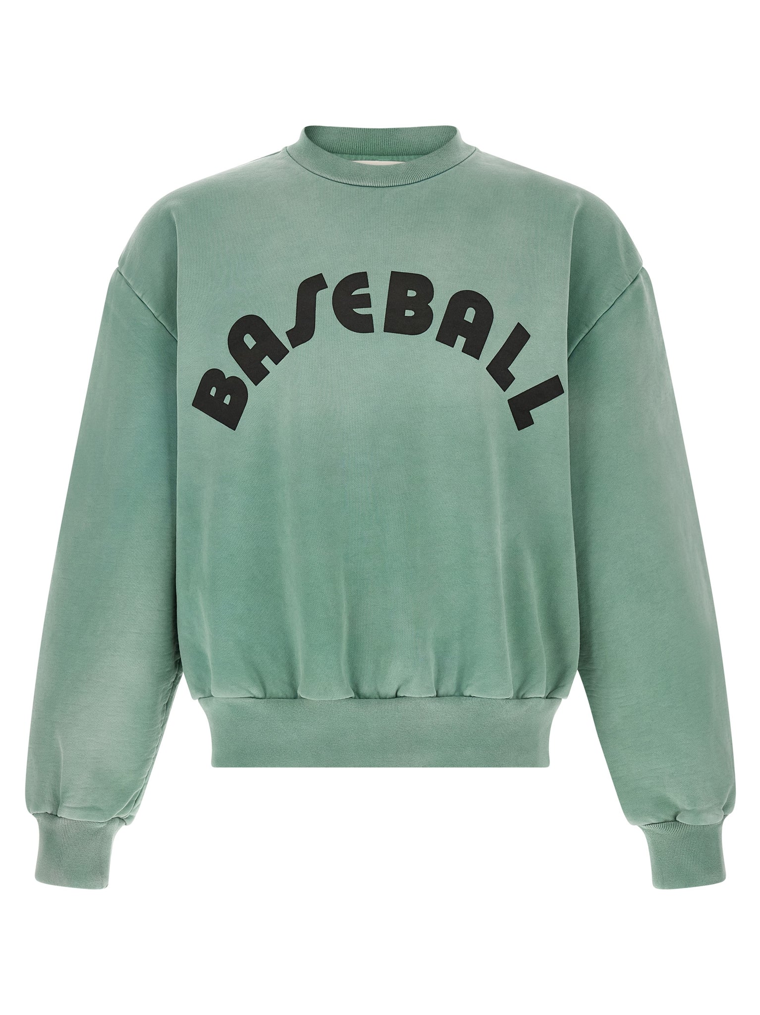 'baseball classic half raglan' sweatshirt in heavy cotton sweatshirt finished with a garment wash and sun discoloration treatment, Graphic print by hand on the front and back, Crew neck, Long sleeves with cuffs and dropped shoulders, Logo patch on the back and back half a raglan. Size and Fit - Classic fitMade in: United States