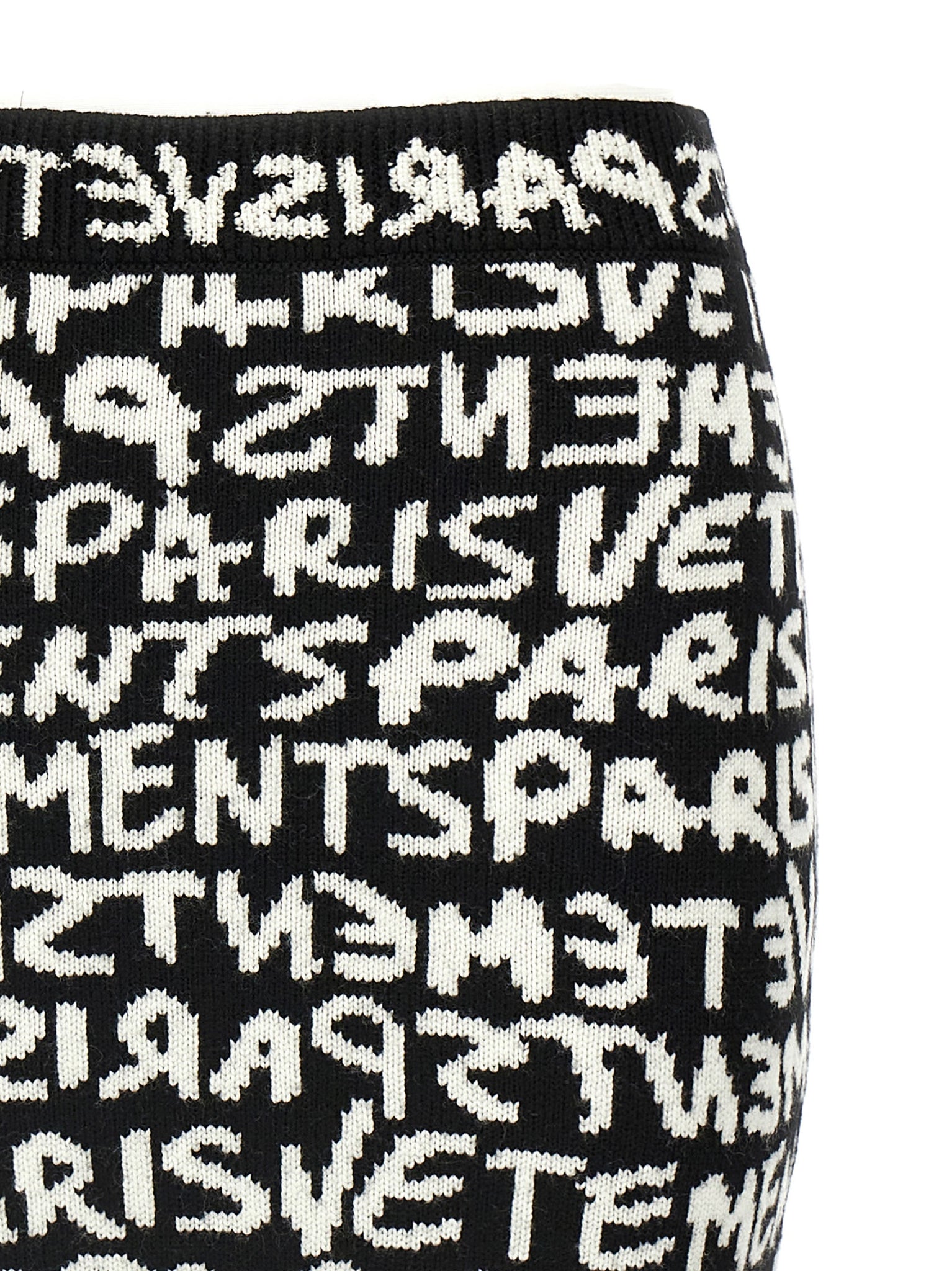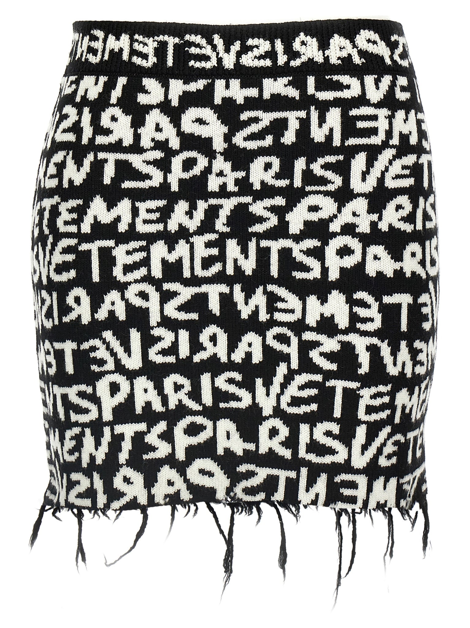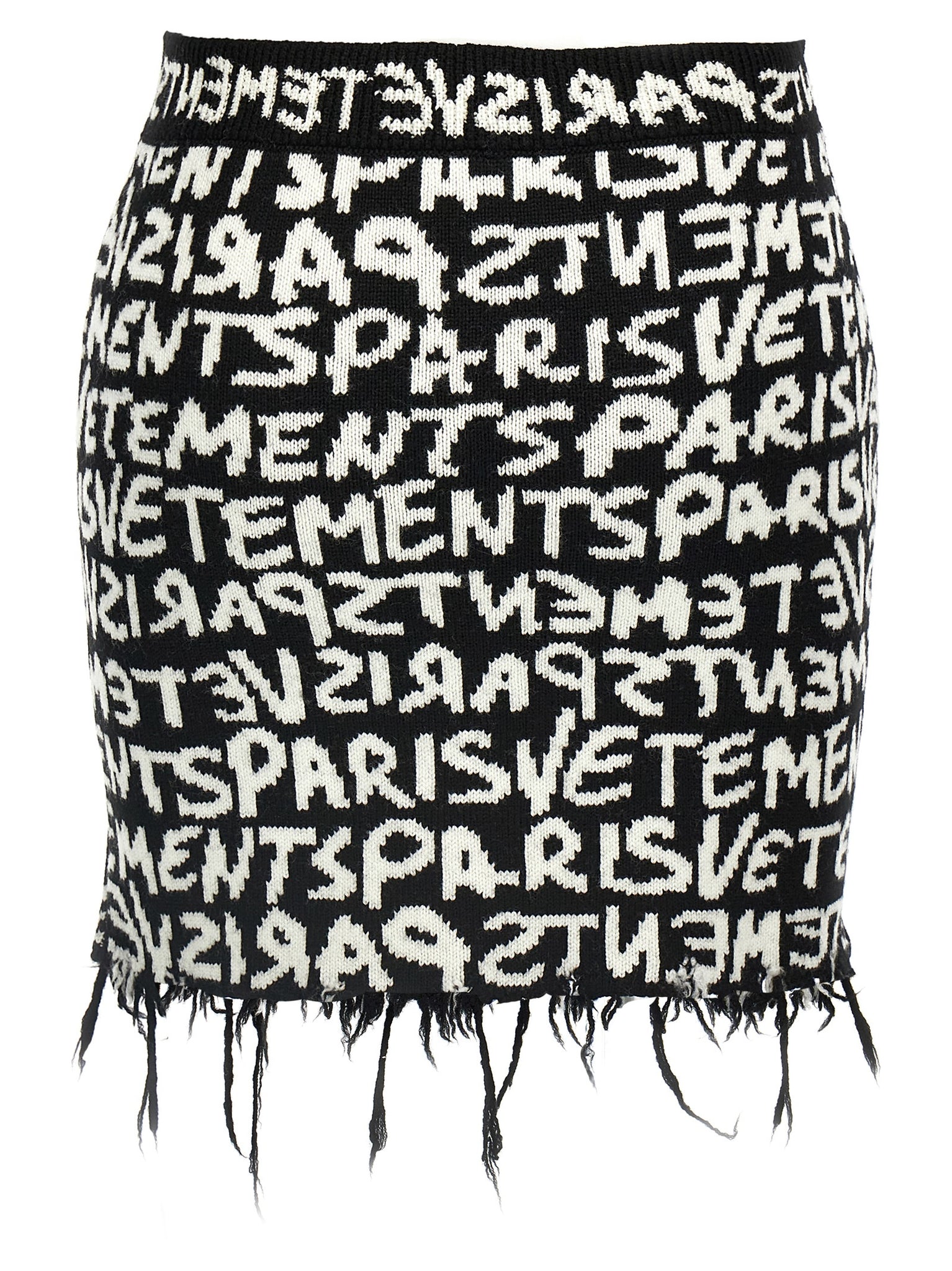 Vetements paris monogram mini' wool knit skirt with all-over jacquard logo, Elastic waistband, Frayed hem. Size and Fit - true to size fit