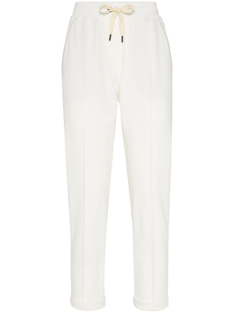 These Brunello Cucinelli trousers in white combine a clean silhouette with an elasticated drawstring waistband for adjustable comfort and two side slash pockets for practicality. The cut offers a true-to-size fit—select your usual size; the model is 1.75m (5ft 8in) wearing size S. Crafted for adult women, they suit tailored or relaxed wardrobes and pair easily with both casual and dressier pieces. Subtle detailing keeps the look refined while supporting everyday wearability.
