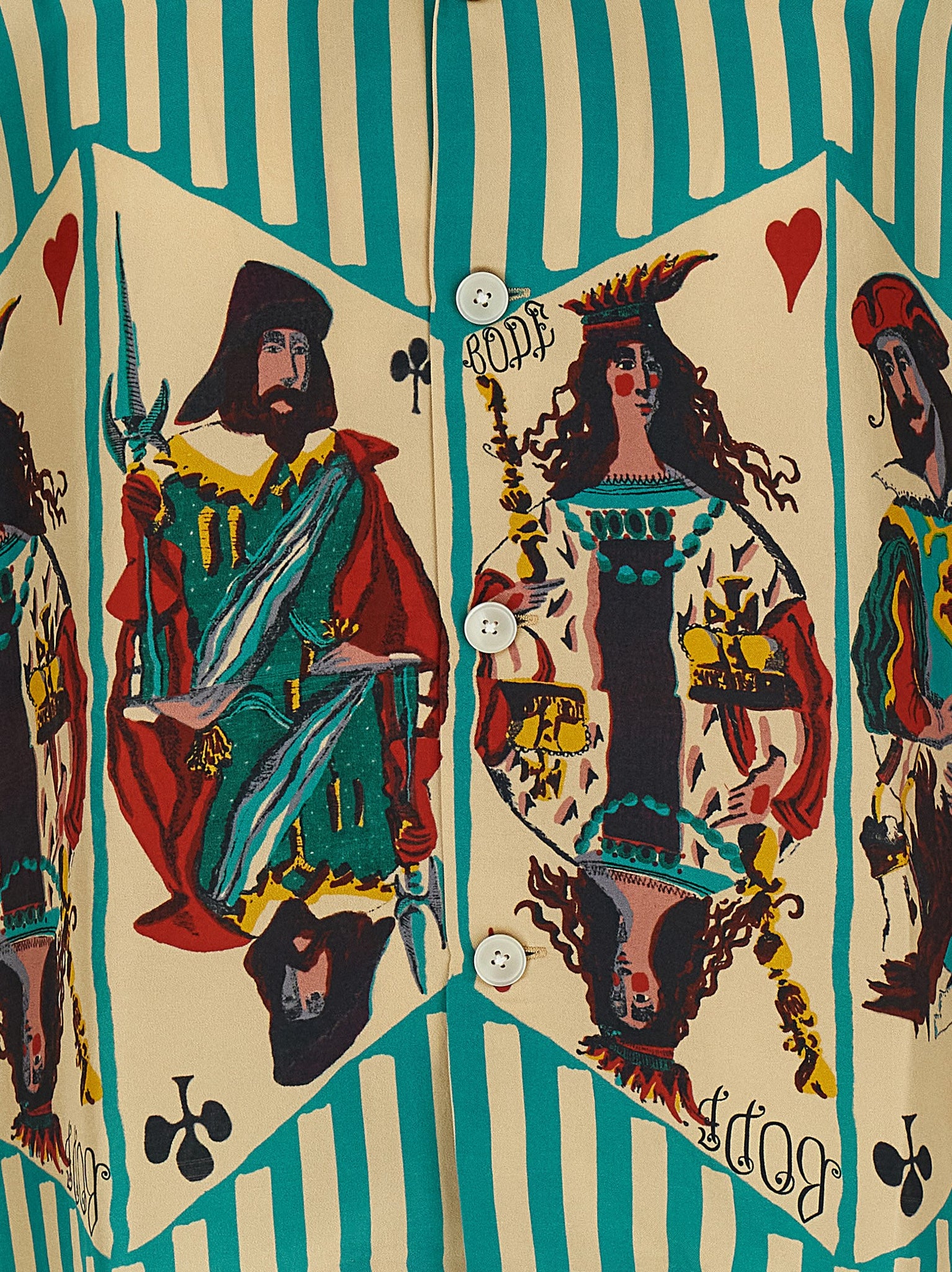 The Bode Royals Shirt offers a lightweight silk feel and a comfortable cut that suits relaxed summer styling. Its deck-of-cards garden print and short sleeves deliver a distinctive visual while the mother-of-pearl front buttons and asymmetrical hem add refined finishing details. Sized for a comfort fit, this bowling-style shirt balances expressive design with easy wear for adult men.