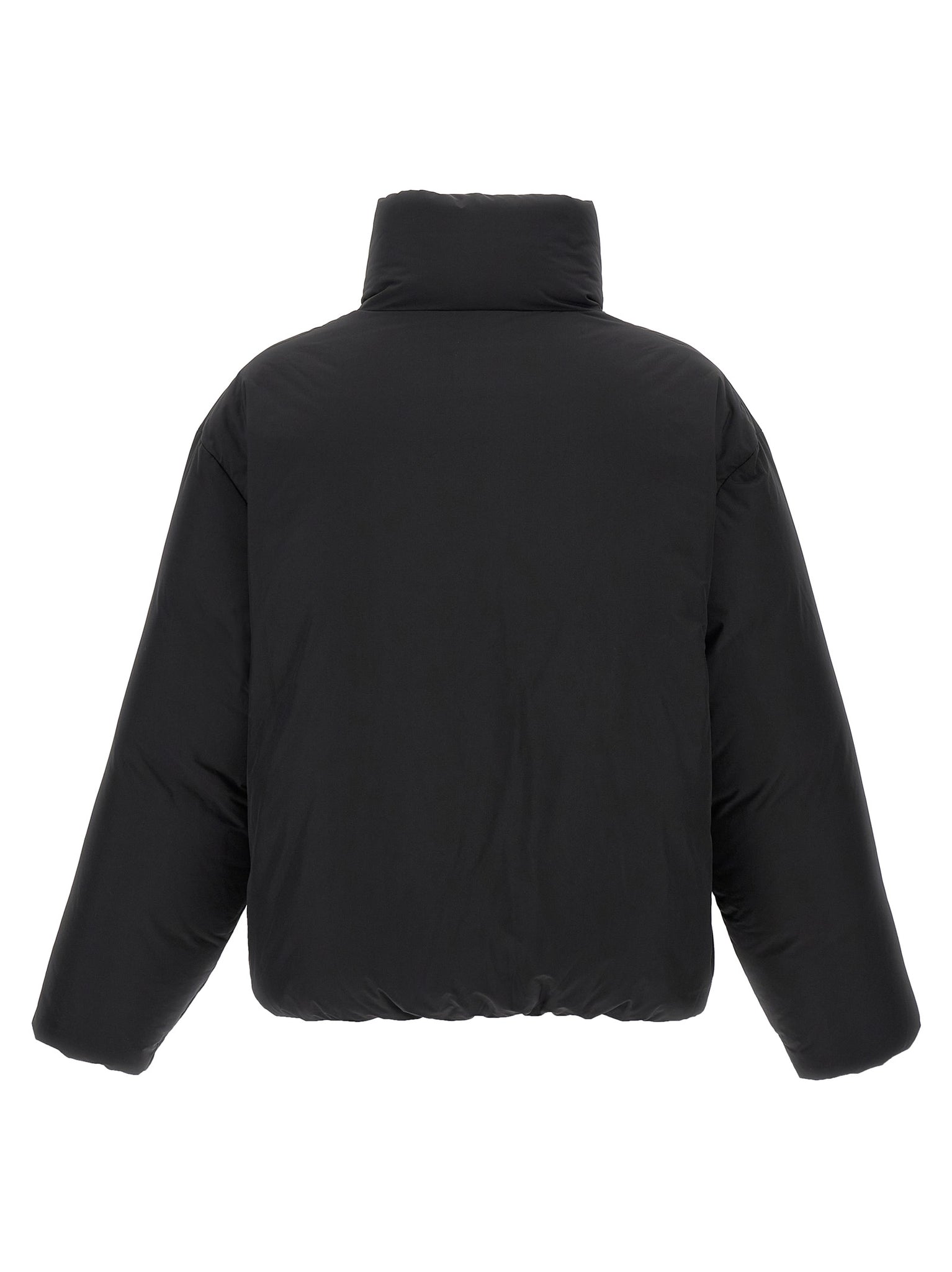 'Ball Nylon Puffer' nylon down jacket with goose feather padding, tone-on-tone 3D silicone logo and front zip closure, high neck, pockets, long sleeves with elastic cuffs, elastic with drawstring on the hem. Size and Fit - Comfort fit