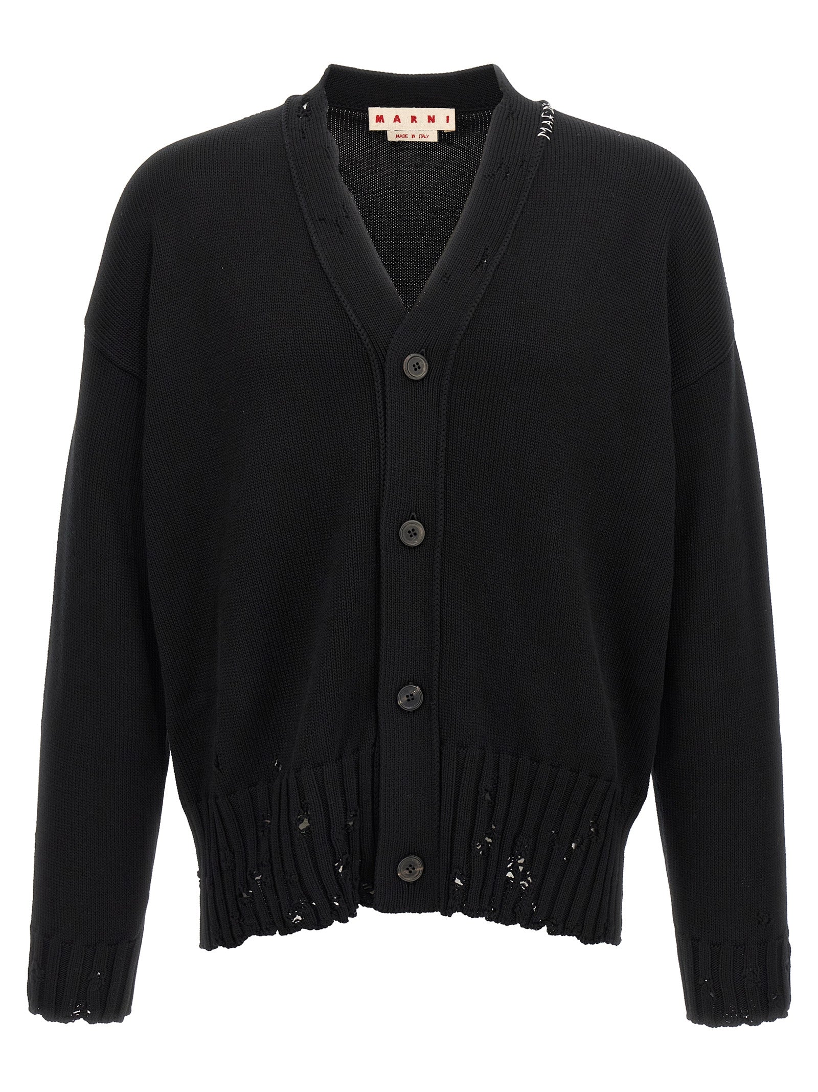 Destroyed effect cotton cardigan, Contrast 'marni symbol' logo embroidery and front button closure, V-neck, Long sleeves with cuffs and dropped shoulders. Sustainable: product made with organic cotton. Size and Fit - Boxy fitMade in: Italy