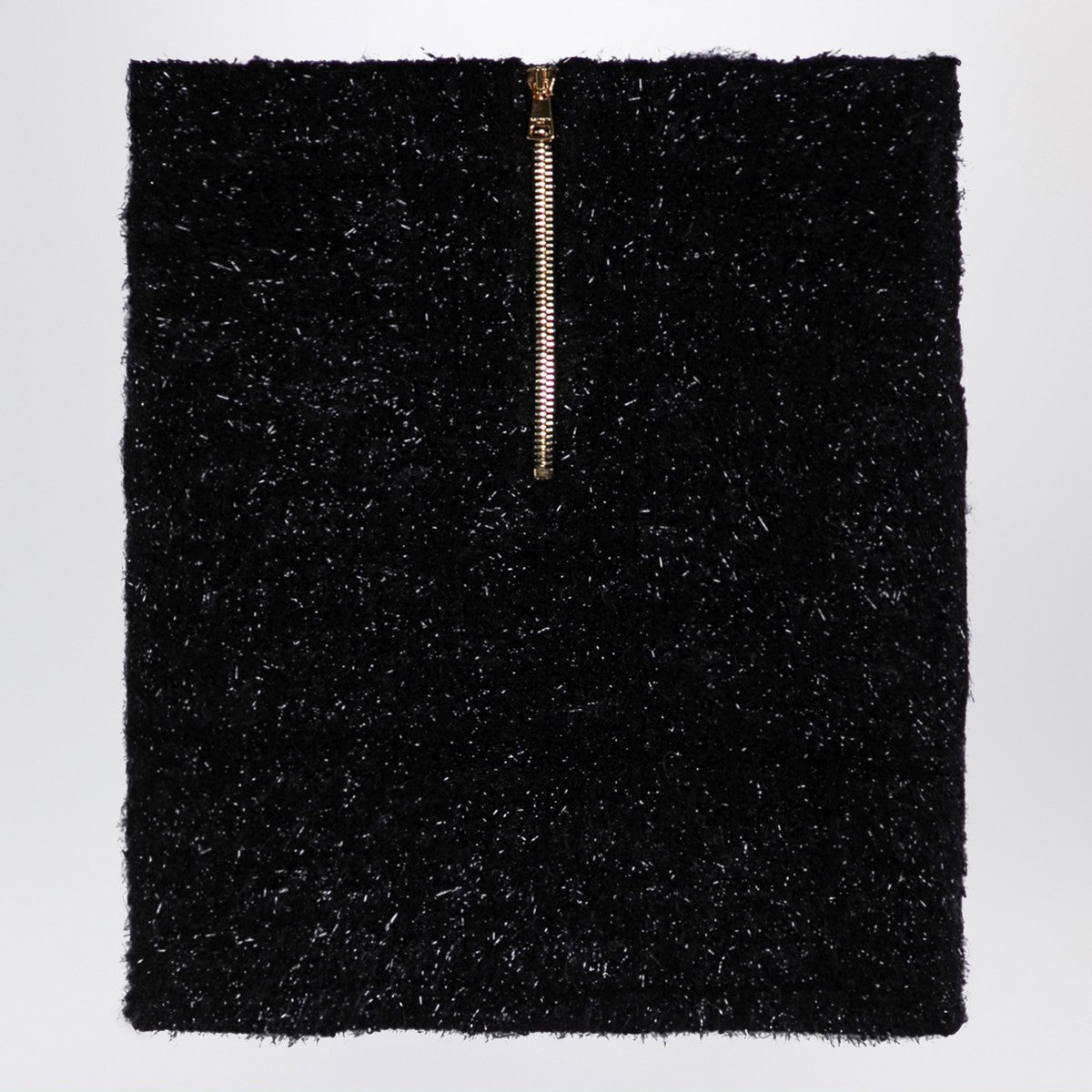 Black cotton and viscose blend miniskirt by Balmain with shiny threads, featuring a back zip fastening and two gold logo buttons on the front. Size and Fit - Model wears size 36 FR Model measurements: Height: 179 cm Chest: 82 cm Waist: 65 cm Hips: 90 cm