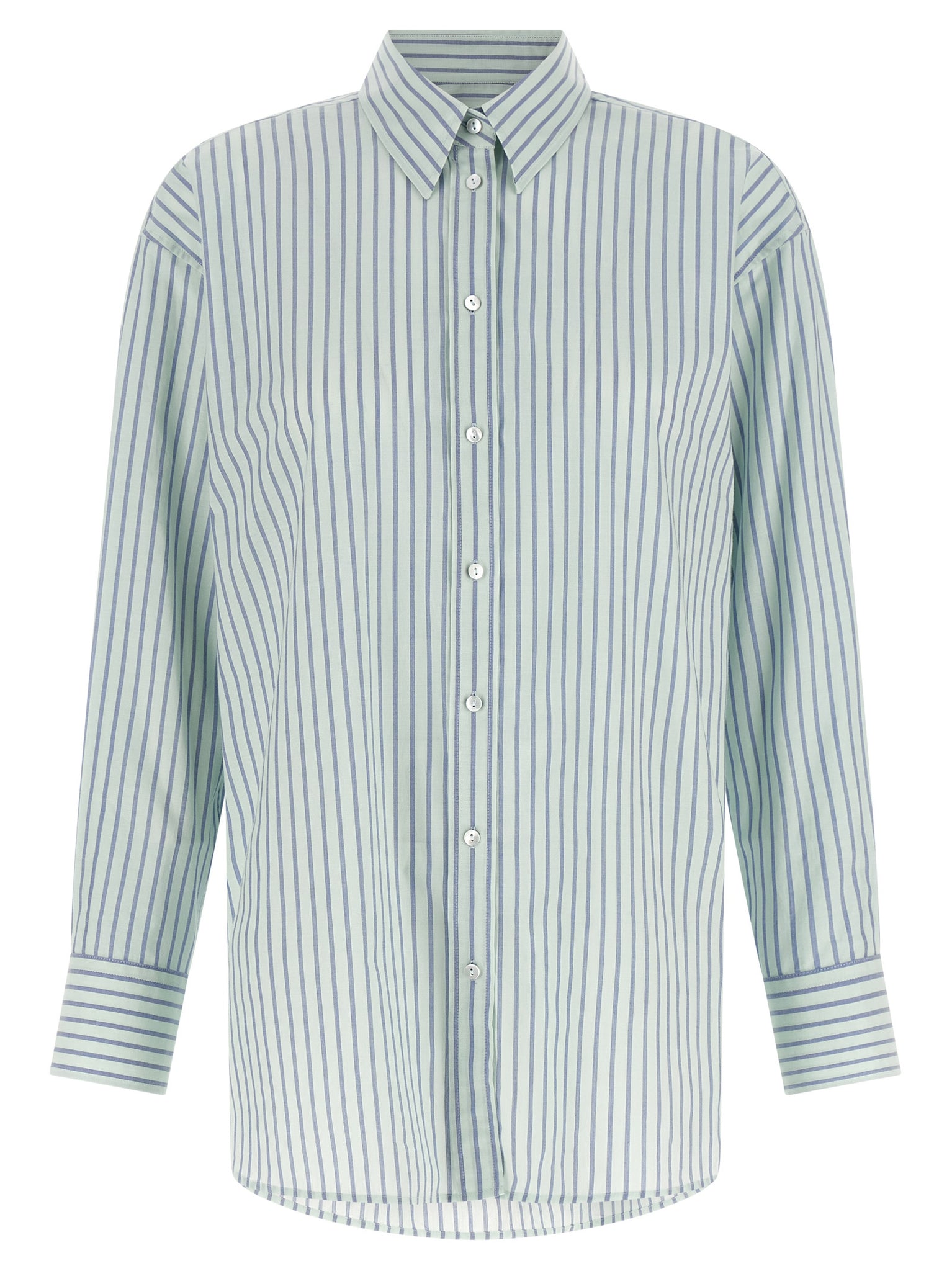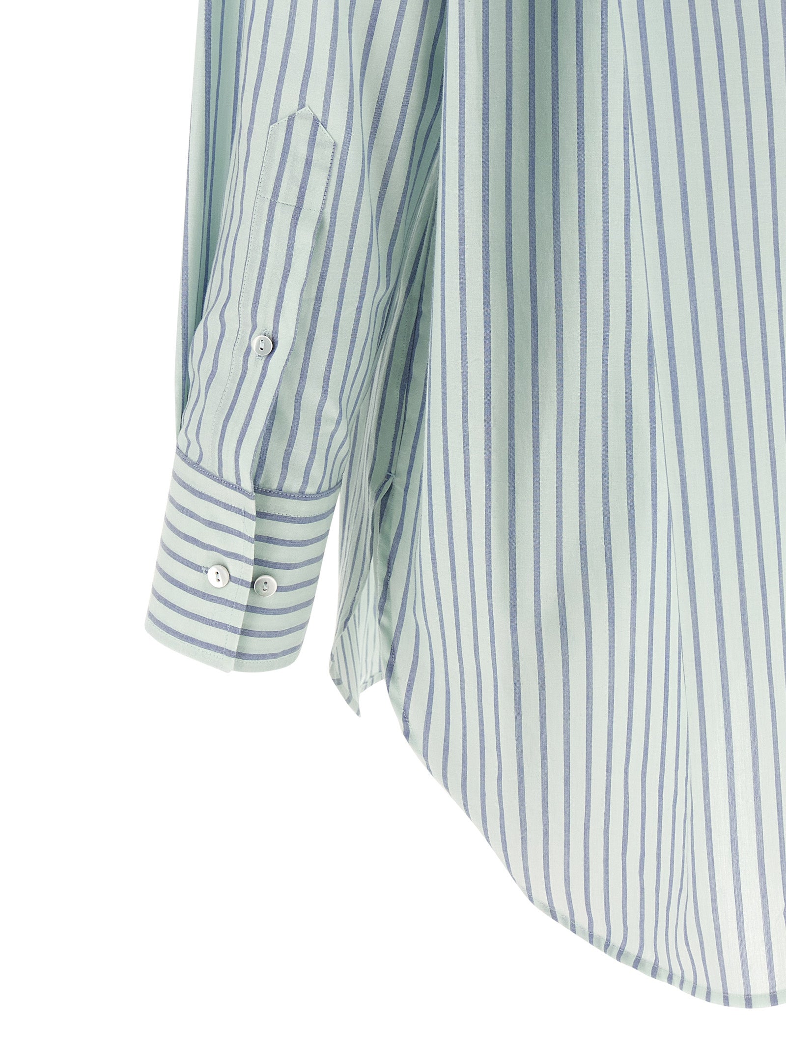 'tessa' shirt in cotton poplin striped pattern, Pointed collar, Front mother-of-pearl button closure, Long sleeves with adjustable cuffs and dropped shoulder, Rounded and asymmetrical hem. Size and Fit - true to size fitMade in: Albania