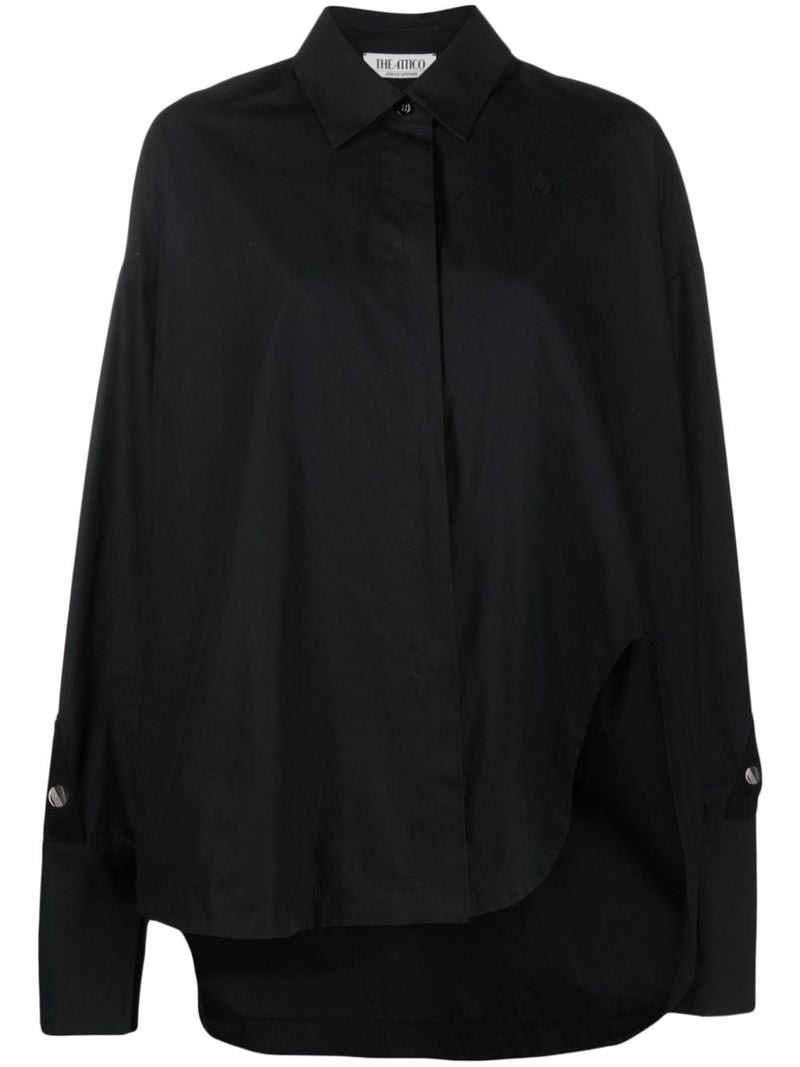 The Attico's black oversized cotton shirt offers a relaxed silhouette with tonal stitching, an asymmetric hem and a concealed front button fastening for a clean look. Studded logo details on the sleeves and rear pair with an embroidered chest logo for subtle branding, while long sleeves with buttoned cuffs and side slits enhance wearability. This piece fits true to size; the model is 1.75m / 5ft 8in wearing size 40 (IT). Discover how the design balances comfort and refined detailing for versatile styling, including disco-inspired evening edits.