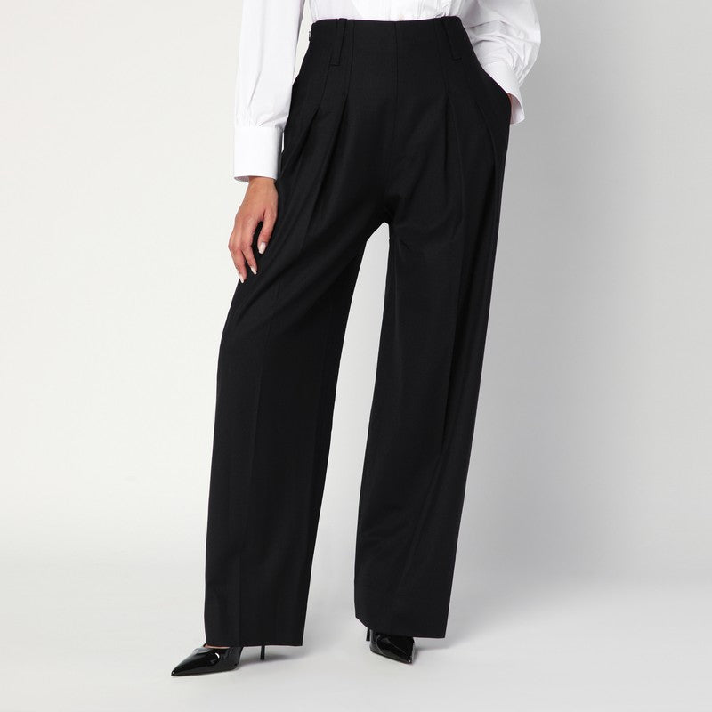 Wide-leg trousers by Victoria Beckham in black virgin wool blend, featuring a high waist with belt loops, side zip closure, two back welt pockets, two side welt pockets, and front pleats. Size and Fit - Model wears size 10 UK Model measurements: Height: 178 cm Chest: 83 cm Waist: 63 cm Hips: 91 cm