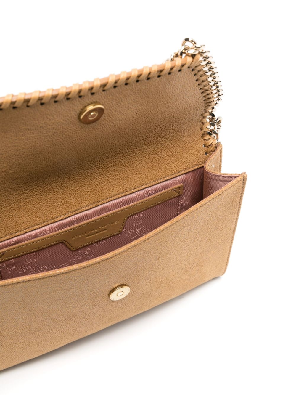 beige chain-link shoulder strap internal slip pocket logo charm whipstitch chain trim mini Falabella mini crossbody bag Size and Fit - Width 8,66 in / 22 cm Height 5,51 in / 14 cm Depth 0,98 in / 2,5 cm Handle 3,94 in / 10 cm Strap 43,31 in / 110 cm