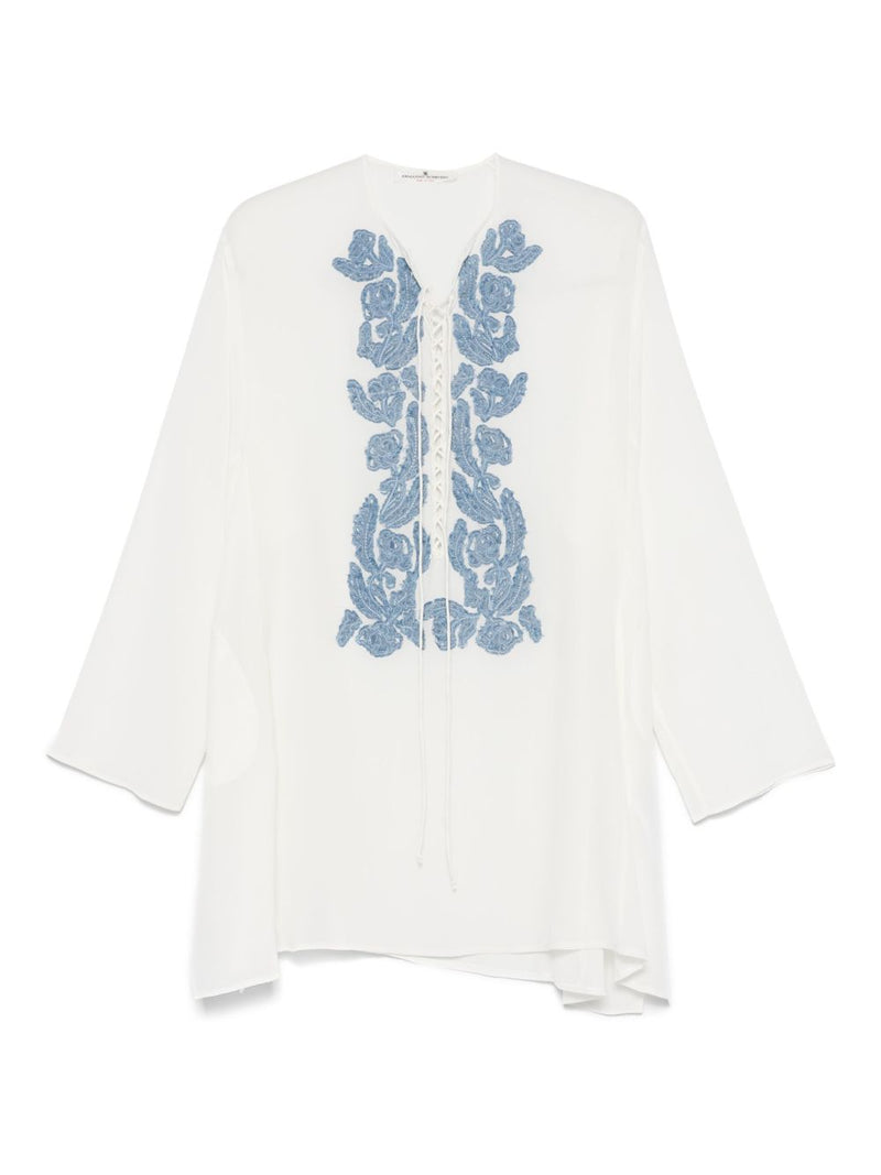 white front lace-up fastening long wide sleeves straight hem Embroidered silk kaftan Size and Fit - This piece fits true to size. We recommend you get your regular size. Model is 1,75m / 5ft 8in wearing size 40 (IT)Made in: Italy
