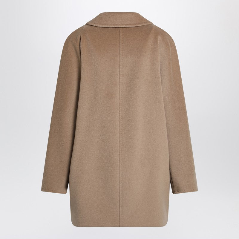 Short double-breasted coat by Max Mara in camel-colored wool and cashmere, characterized by an oversized line, classic wide lapels, long foldable kimono sleeves, two side welt pockets, and button closure. Size and Fit - Model wears size 42 IT Model measurements: Height: 178 cm Chest: 89 cm Waist: 62 cm Hips: 88 cmMade in: Italy