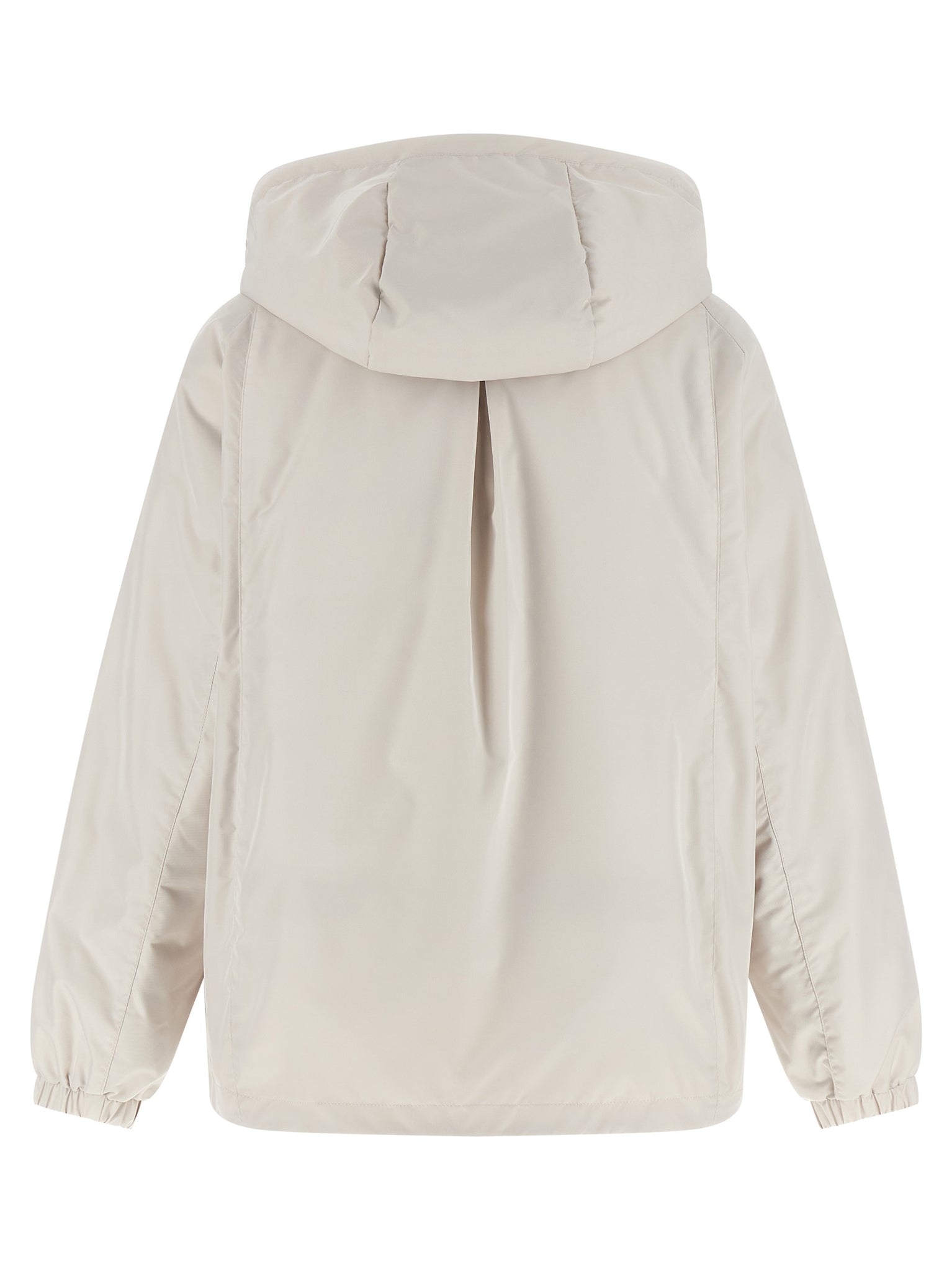 'Soave' jacket - 'Acqua' line in water-repellent shape memory technical fabric slightly padded with goose down, adjustable and removable hood, standing collar, front zip closure, pockets, long raglan sleeves with elastic cuffs, drawstring on the hem, quilted boudin lining. Size and Fit - true to size fit